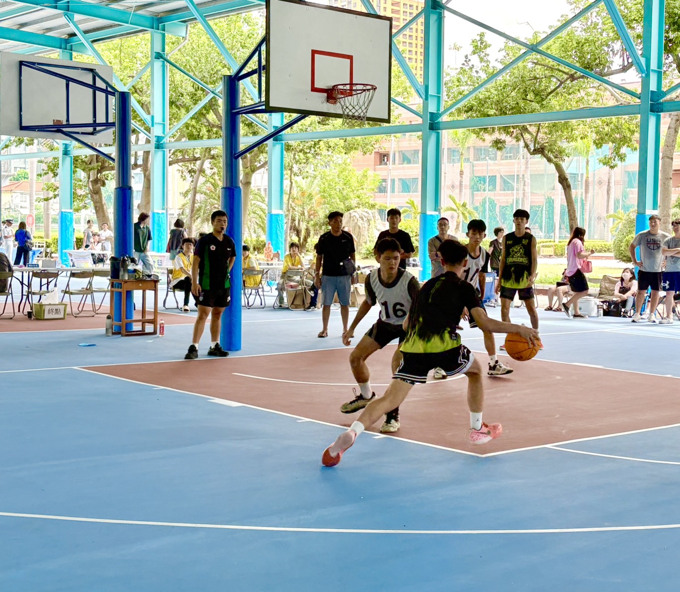 今日籃球比賽,向上國中、漢口國中與居仁國中由教練帶隊,其餘隊伍都是青少年們自己組隊參加。台中市警察局第六分局和台中市少年輔導委員會也到場宣導青春專案,期待青少年們暑假從事休閒活動外,也要注意避免接觸犯罪問題,並注意自身安全,才會有快樂的暑假生活。(8/10*7)*社會局