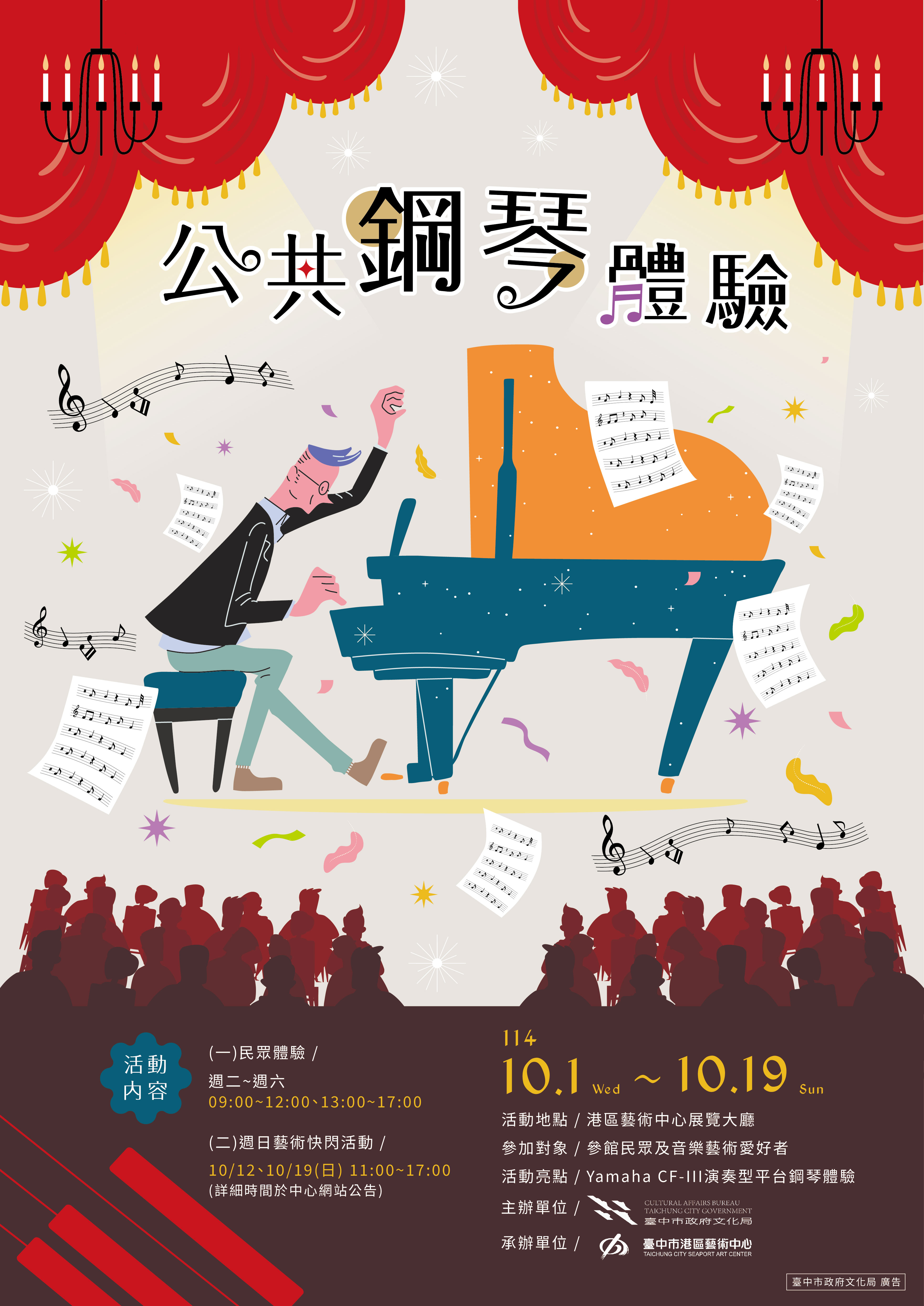 為推廣本市藝術生活化,分享音樂的美好,港區藝術中心於10/1(星期三)至10/19(星期日),於展覽大廳提供民眾體驗鋼琴彈奏(Yamaha CFIII 平台鋼琴),並宣傳爵士音樂節、好有藝思表演藝術節、清眷森活藝術節等表演節目訊息。