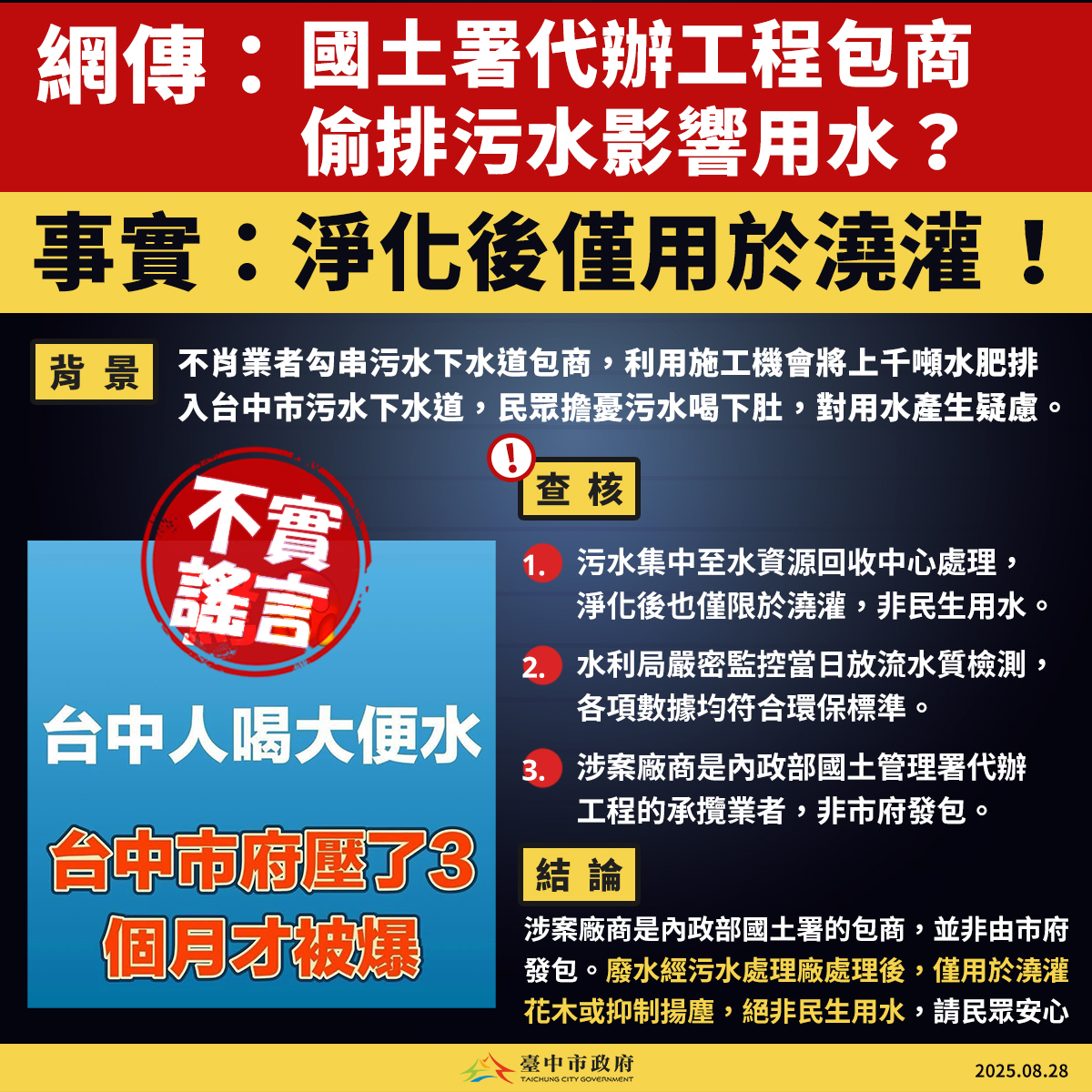 涉案廠商是內政部國土署的包商,並非由市府發包。廢水經污水處理廠處理後,僅用於澆灌花木或抑制揚塵,絕非民生用水,請民眾安心。