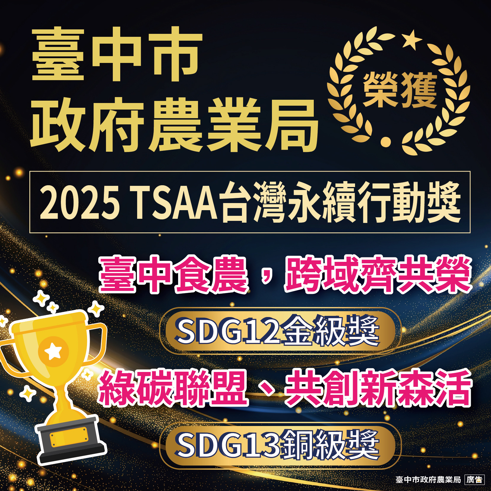 台中市政府農業局參加「2025年第5屆TSAA台灣永續行動獎」,以「台中食農,跨域齊共榮」及「綠碳聯盟、共創新森活」兩項專案脫穎而出,分別榮獲SDG12責任消費與生產項目金級獎及SDG13氣候行動項目銅級獎,展現台中市推動食農教育與淨零永續的卓越成果。