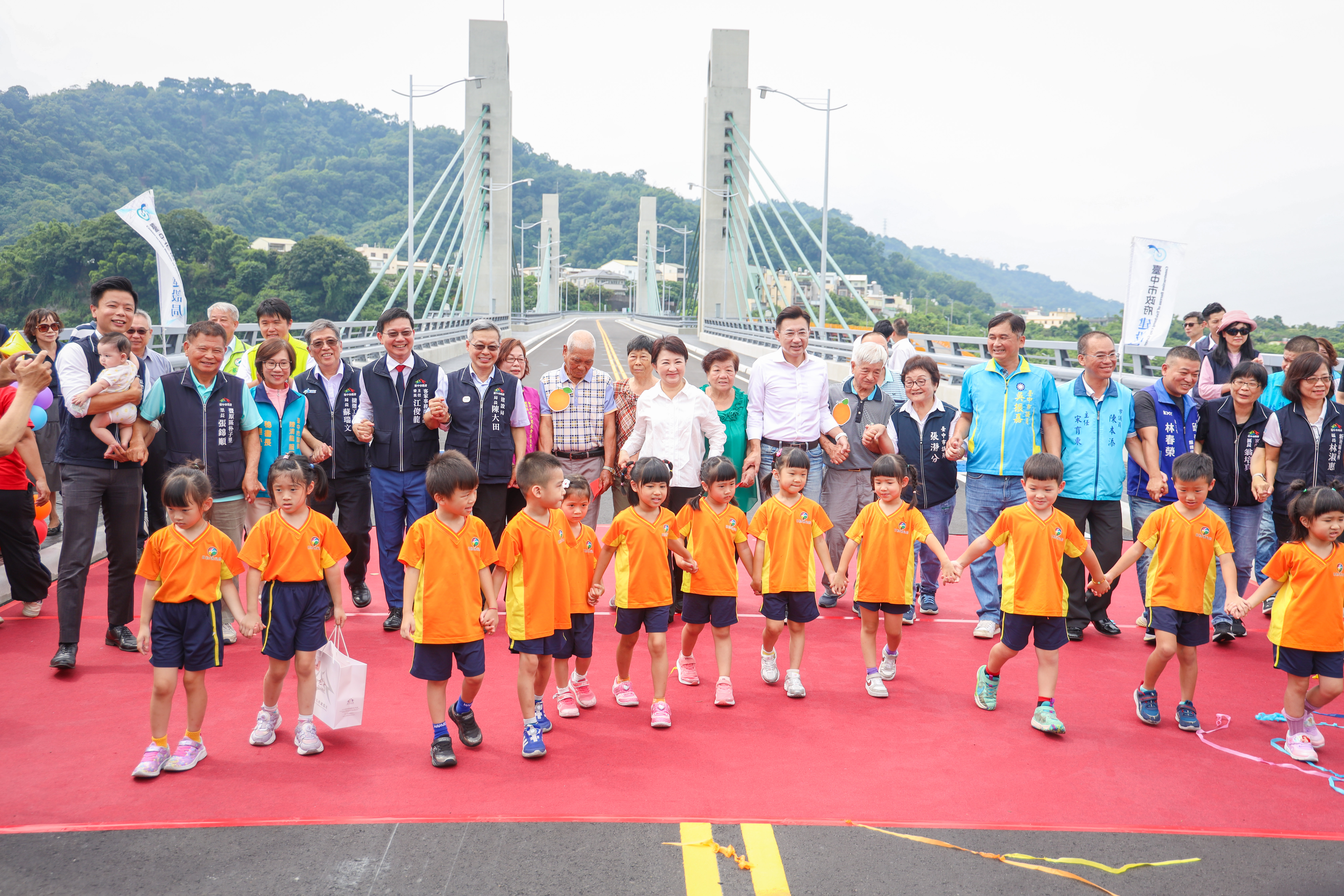 副院長也說到,這座橋的意義不只在於安全與便利,更兼具美觀與地方特色。橋梁設計融入在地農特產「柑橘」的意象,讓橋樑不僅是交通設施,也是山城的重要地標。從橋上可遠眺大甲溪與石岡水壩,視野開闊,更與周邊的腳踏車道、觀光景點串連,未來將成為兼具交通功能與觀光價值的新亮點。他也特別感謝過去3年來協助交通引導與維護的志工,無論風雨都守護地方交通,才有今日順利完工的成果。