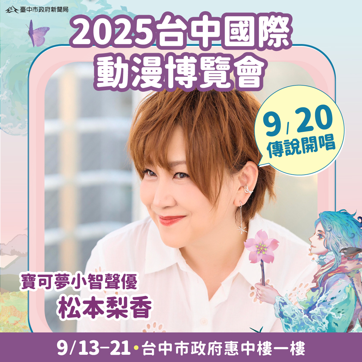 2025台中國際動漫博覽會將於9月13日至21日在台中市政府惠中樓盛大舉辦,今年以「漫想傳說」為主題,打造九天不間斷的動漫盛典。新聞局今日公布兩大重磅活動——9月20日舉行的「動漫音樂會」特別邀請日本殿堂級聲優兼歌手松本梨香首度來到台中,松本梨香是《寶可夢》主角「小智」的聲優,也是初代主題曲〈目標是神奇寶貝大師〉的原唱者,將在台中現場重現跨世代的經典歌聲;而9月14日的「國際名人講座」,則邀請日本動畫導演吉平直弘與作曲家片山修志同台分享創作心法,讓觀眾深入體驗影像與音樂交織饗宴。