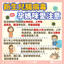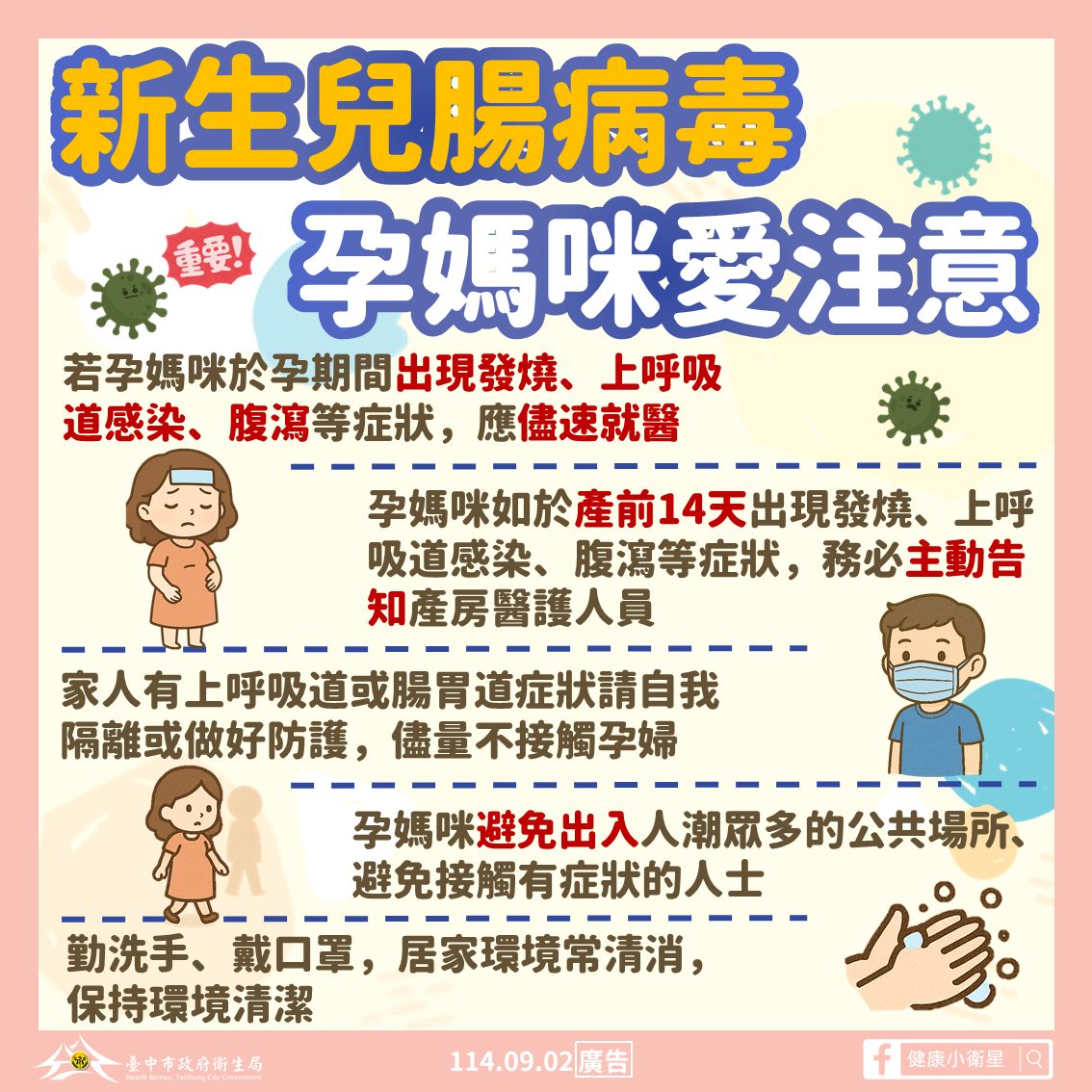 曾局長補充,截至91日止,全國累計15例腸病毒感染併發重症確定病例,其中多數為伊科病毒11型感染。本市新增2例新生兒確診,均於8月中旬出現發燒、活力下降等症狀,經中央實驗室檢測確認感染伊科病毒11型;其中1例已康復出院,另一例仍在加護病房治療中。今年迄今台中已累計5例重症確定病例,均為伊科病毒11型感染。衛生局特別提醒,準媽媽若出現發燒、腹瀉等症狀應及早就醫,生產前14天內如有不適,務必主動告知醫護人員,並落實手部衛生及環境清潔,以守護新生兒健康。