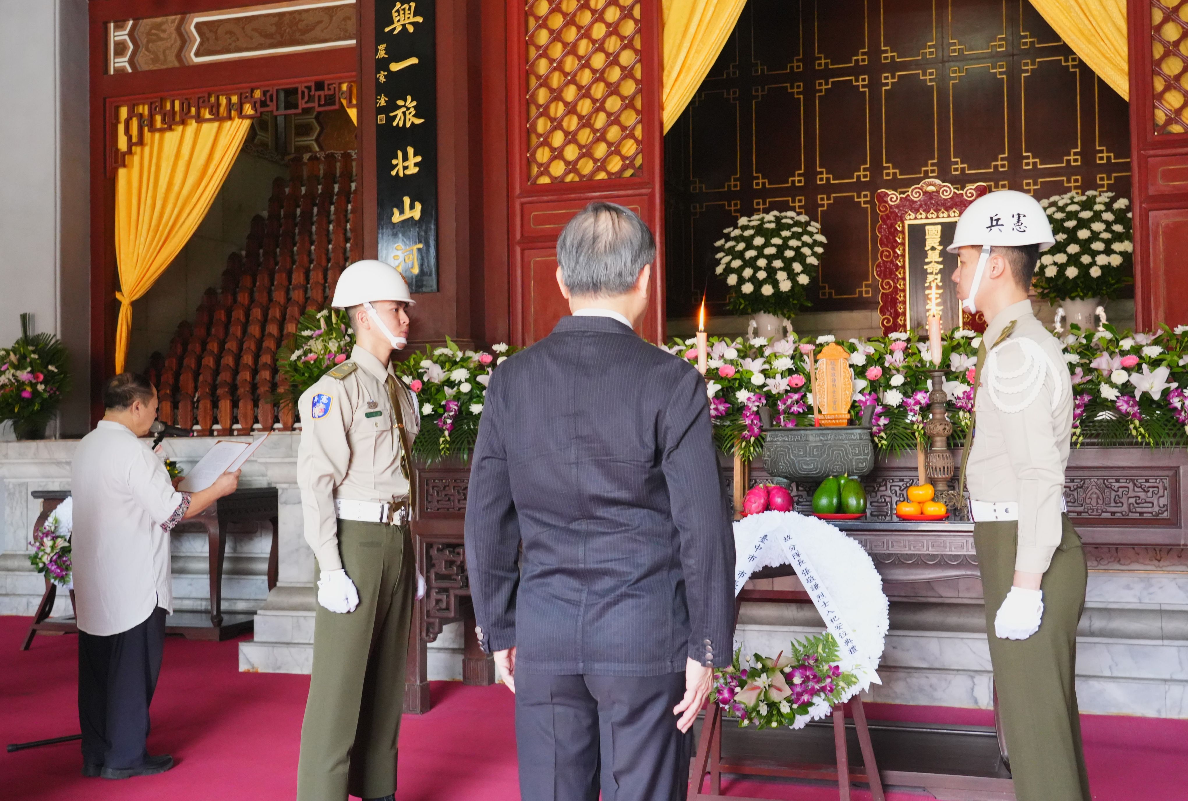 黃副市長表示,今天是93軍人節,每年此時忠烈祠都會舉行秋祭國殤典禮,追思為國捐軀的烈士,以及因公殉職的軍警消、民防與殉難人民,向他們捨生取義的精神致上最高敬意。今年典禮前,特別舉行新北市消防局分隊長張敬謙烈士的入祀儀式,張分隊長年僅36歲,於丹娜絲颱風後在新店水域執行救援任務時不幸殉職,展現盡忠職守、捨身奉獻的精神,往後將與歷代烈士一同由國家隆重緬懷。