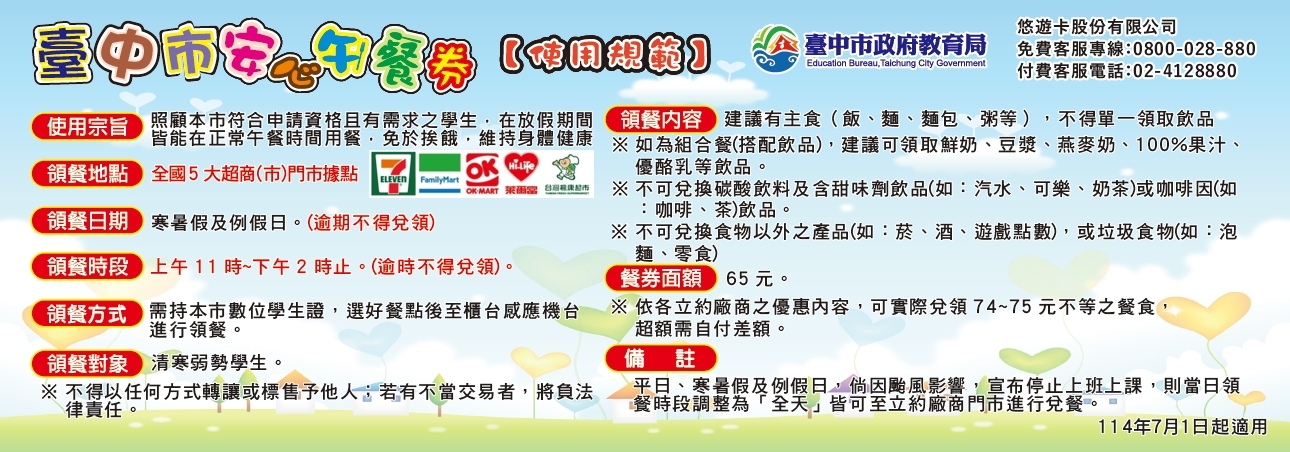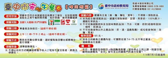 教育局指出,安心午餐券實施對象包括低收入戶、中低收入戶、家庭突遭變故或經學校查證確屬家庭經濟困難且導師認定者,過去台中市弱勢學生持台中市數位學生證,在早上11時至下午2時至五大超商(市),操作KIOSK多元事務機或至櫃台感應機台,即可完成換餐。