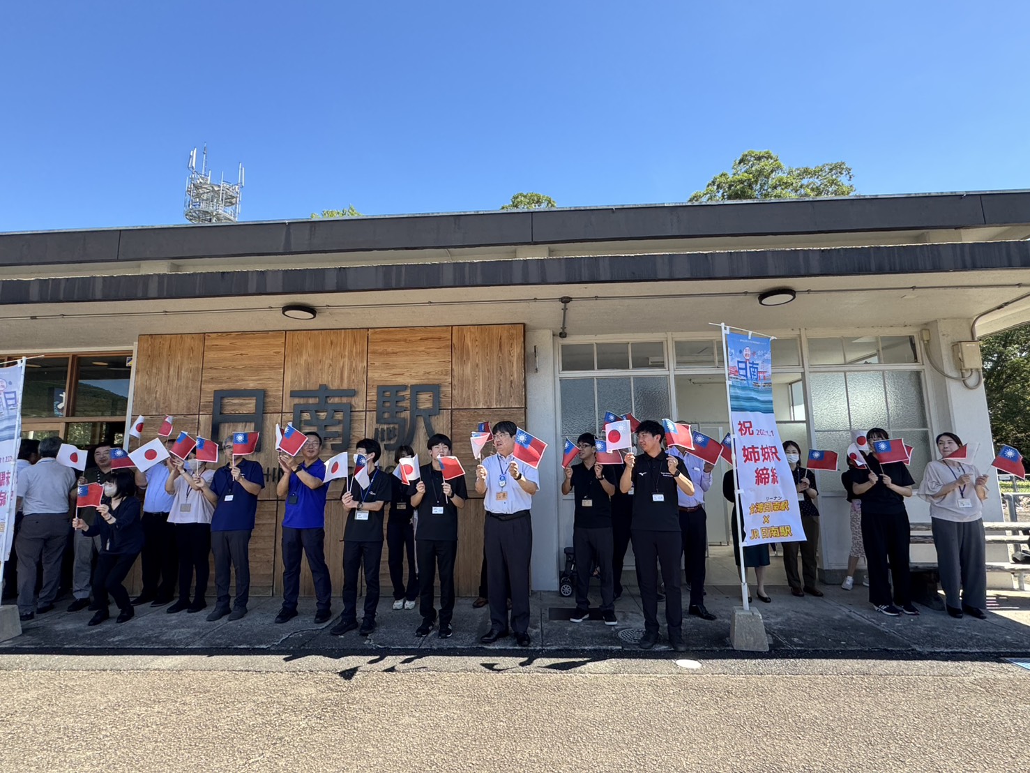 中市府參訪團與日南市府團隊在日南車站合影