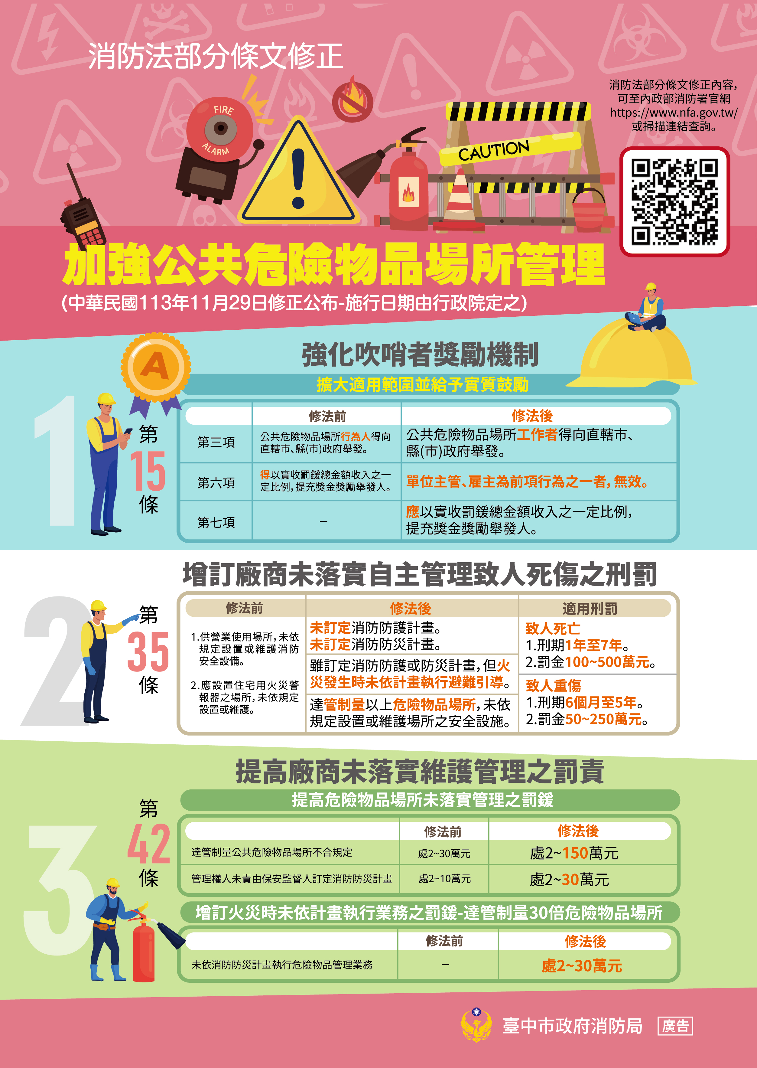消防局強調,今年6月起,新版消防法已正式上路,除強化「吹哨者獎勵機制」,更對未落實自主管理造成死傷的業者祭出刑責,並大幅提高未落實維護管理的罰則。此修法也提醒業者「別再心存僥倖!」