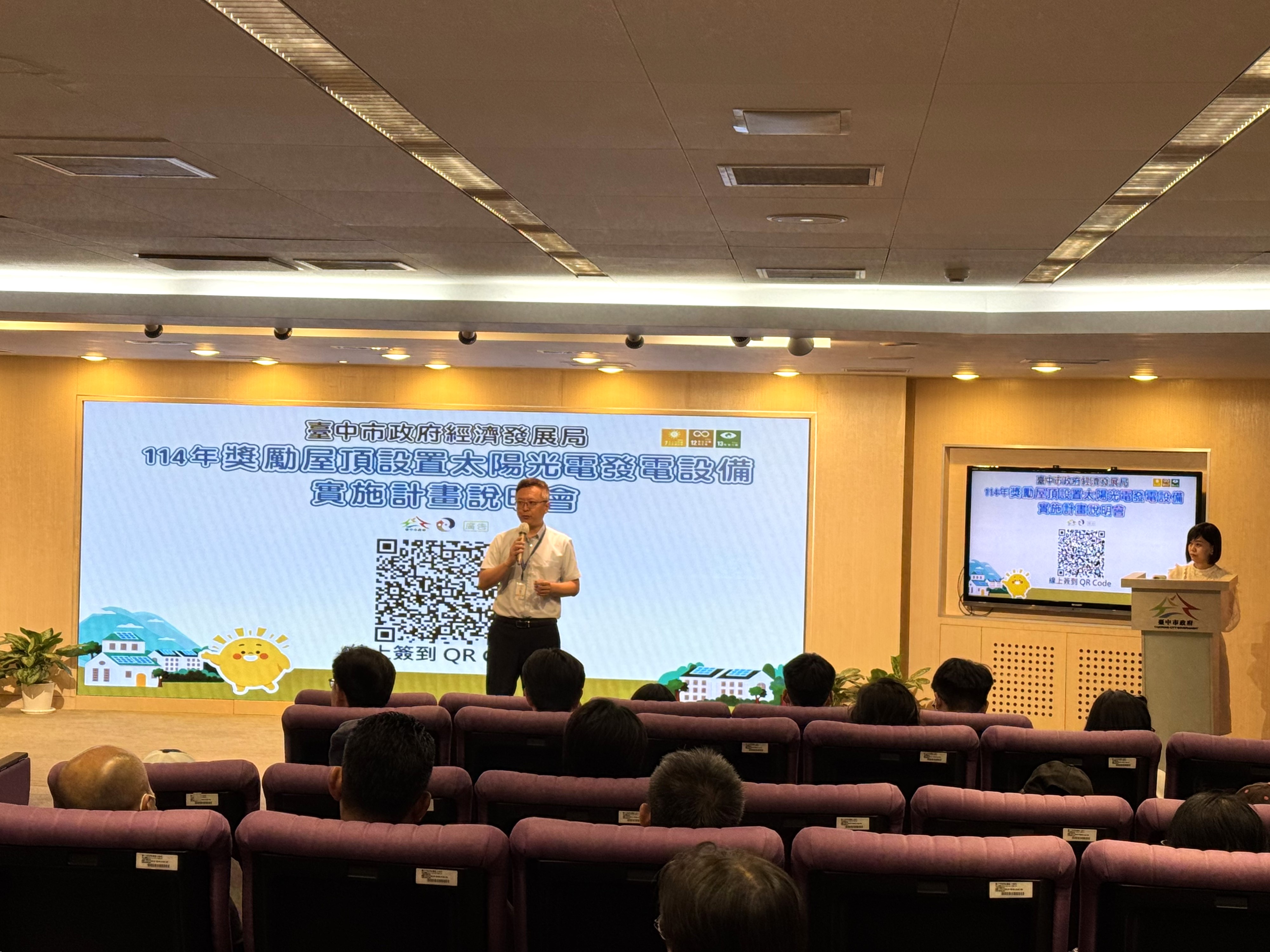 台中市政府經濟發展局推動「114年獎勵屋頂設置太陽光電發電設備實施計畫」,針對建築物頂層面積1,000平方公尺以下的私有建築物屋頂設置太陽光電發電設備,如民宅、社區及廠房等,裝置容量每瓩獎勵3,000元,單一建物最高30萬元,總獎勵經費計7,200萬元,申請至今年10月27日或獎勵款用罄為止。經發局今(8)日舉辦說明會,希望透過獎勵計畫讓人人都能參與綠能,打造淨零減碳、永續發展綠能城市。