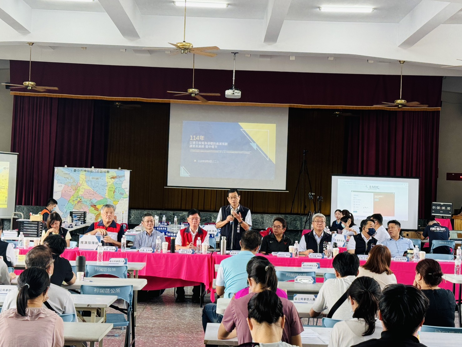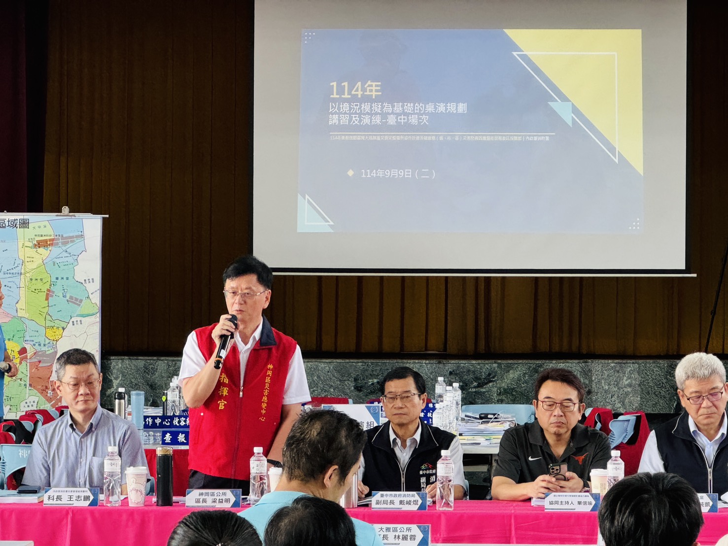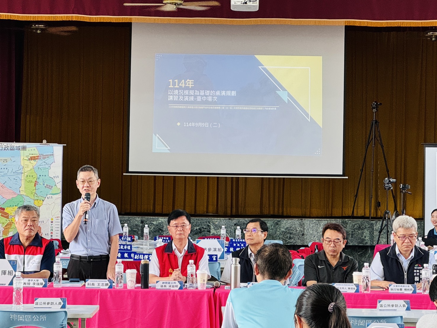 為提升地方政府面對大規模地震的整備與應變能力,台中市政府今(9)日在神岡區公所大禮堂辦理「114年度地震災害桌上兵棋推演」,此次活動由市府消防局及神岡區公所承辦,並由內政部消防署王志鵬科長及消防署強韌計畫協力團隊單信瑜教授共同指導,活動邀集轄區內各防救災相關單位共同參與,模擬地震災害發生後之應變處置作為。