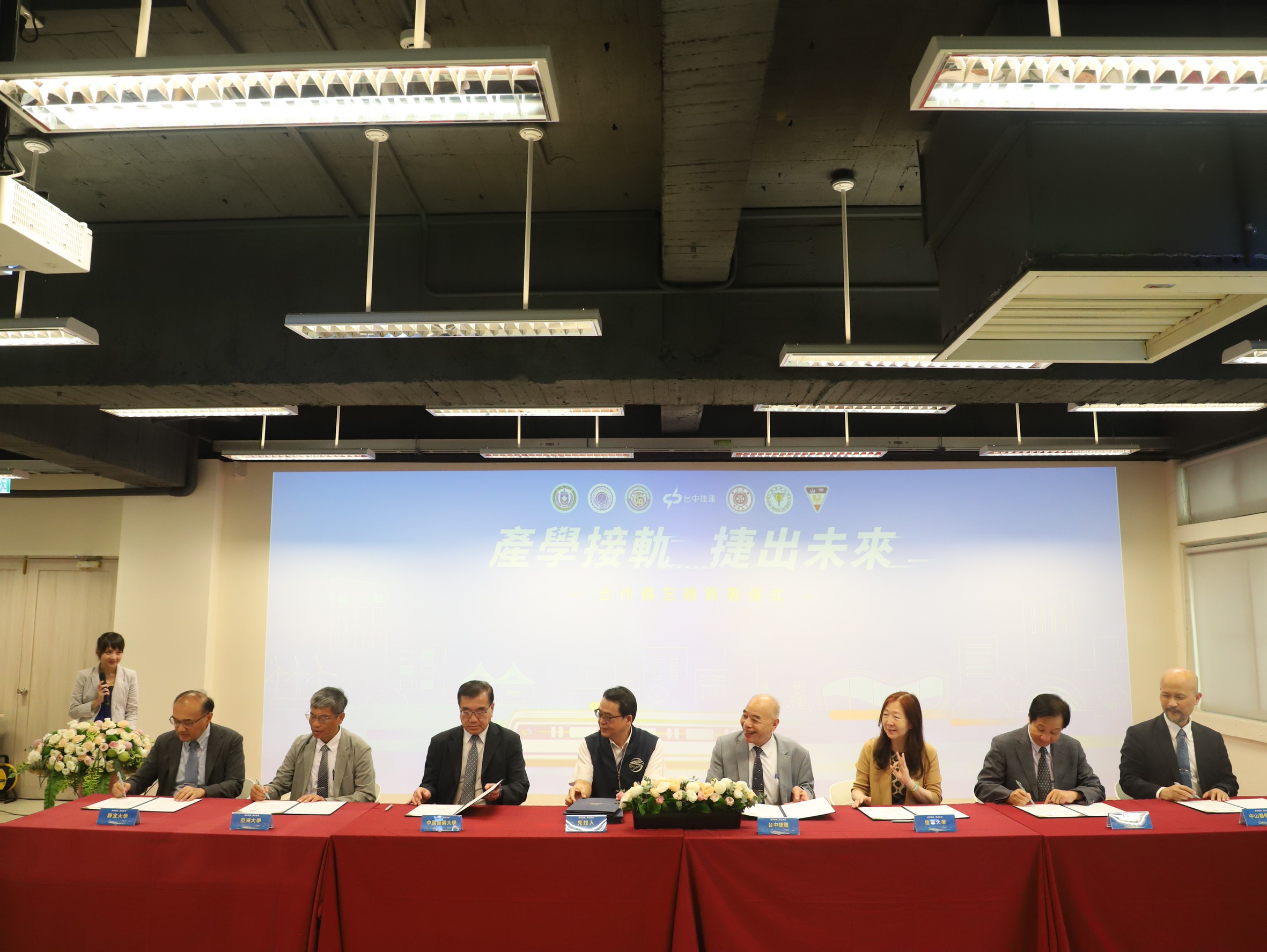 在台中市政府黃崇典秘書長見證下,中捷公司董事長顏邦傑與逢甲大學校長王葳、東海大學校長張國恩、靜宜大學副校長楊昭順、亞洲大學副校長施能義、中山醫學大學副校長宋賢穎及中國醫藥大學副校長薛博仁共同簽署MOU。未來,中捷將安排專業講師進入校園開設軌道專業課程,讓學生在學期間即奠定專業基礎,提升未來就業競爭力。