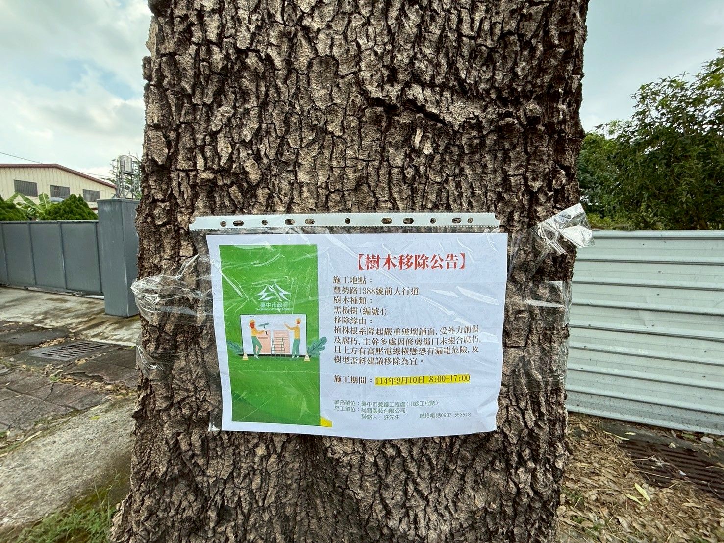 建設局長陳大田表示,市長盧秀燕上任以來,積極打造人台交通環境,持續推動更安全、便利的行人空間建設。台次豐勢路人行道上的樹木經專業評估發現,該路段黑板樹因年久,樹體浮根外露,導致周邊人行道磚面嚴重掀起,影響市民通行安全;部分樹木更出現根株受損、主幹腐朽、中空及孔洞等情況,加上樹冠高大且緊鄰高壓電線,存在高度公共安全風險。