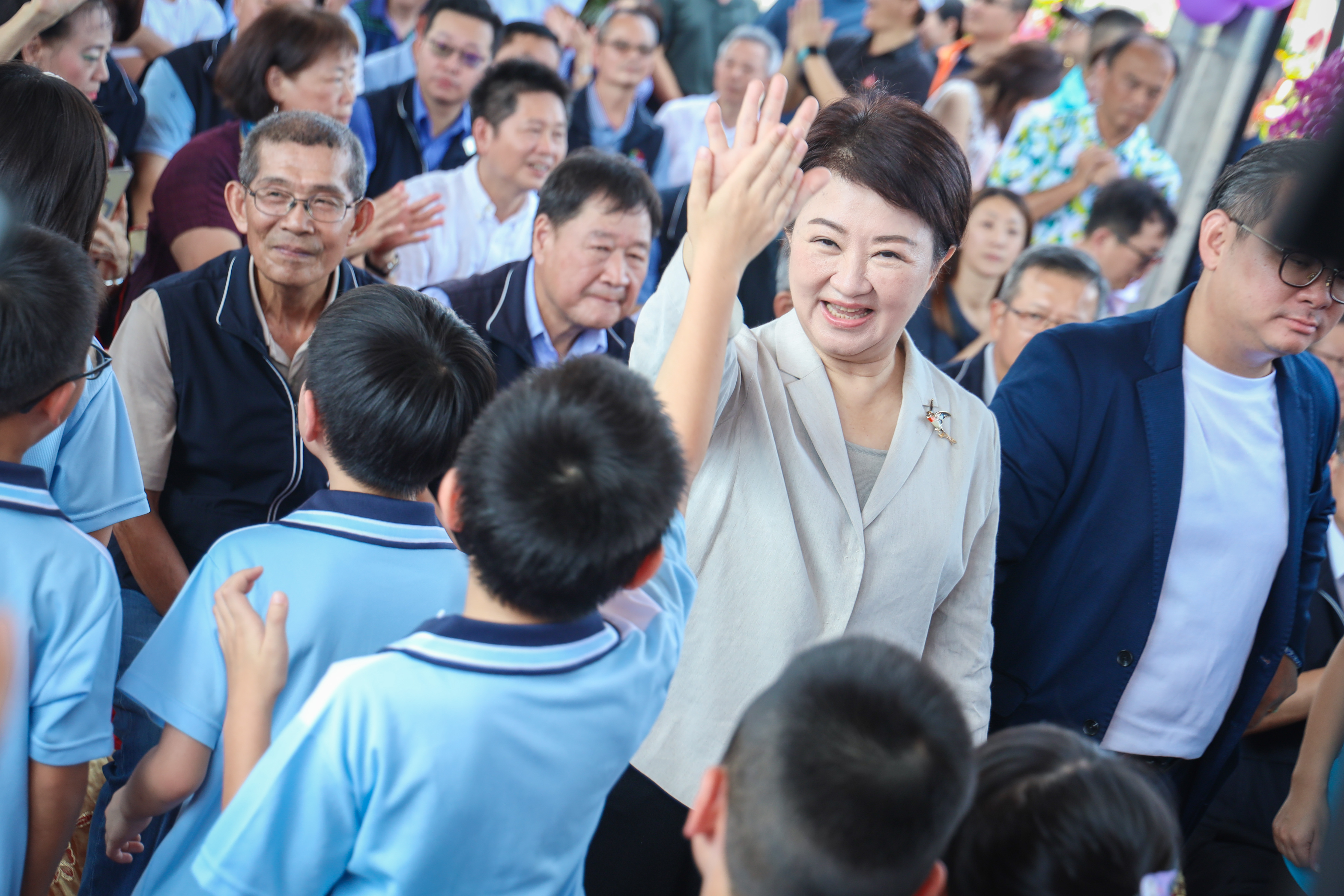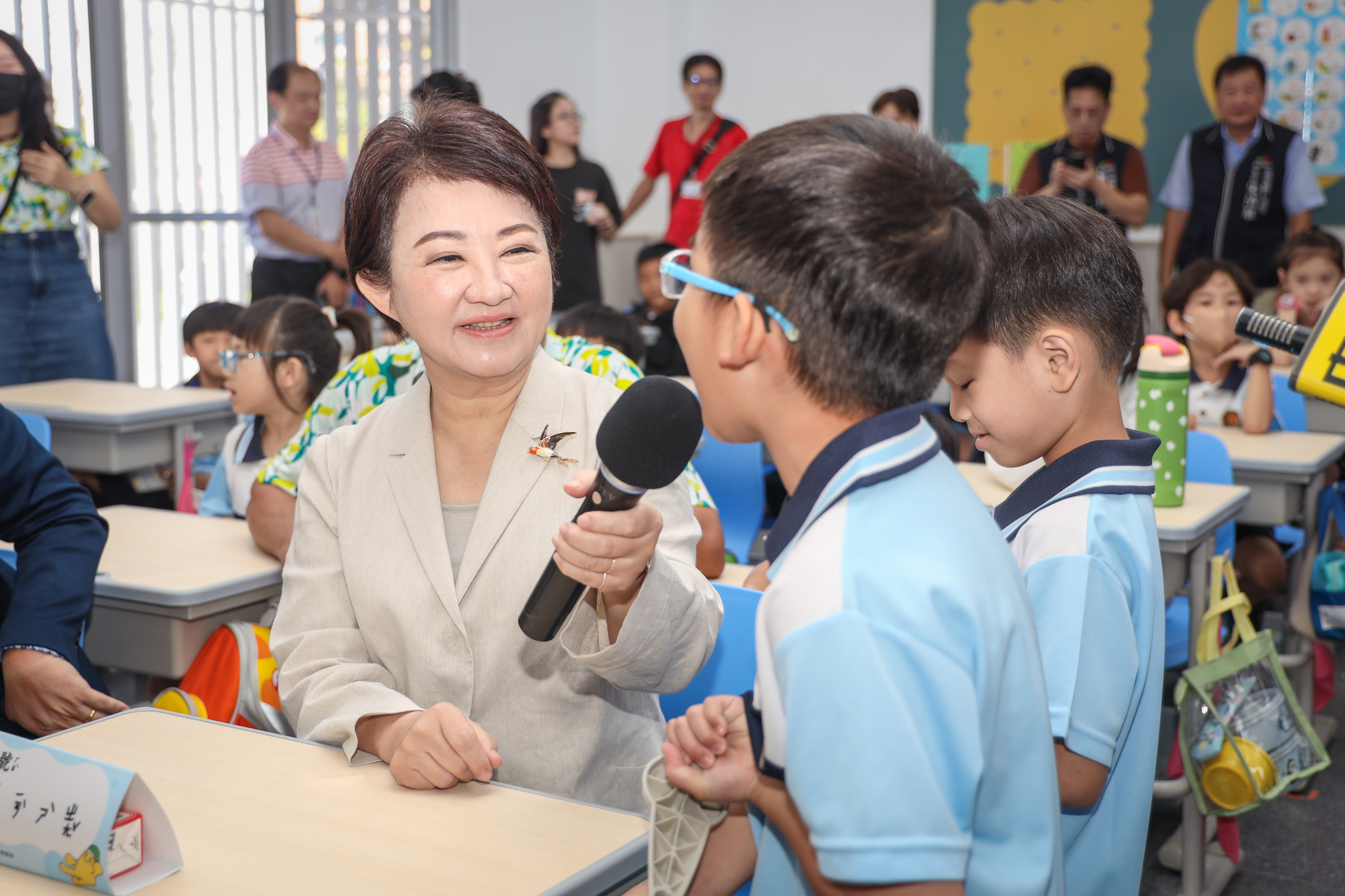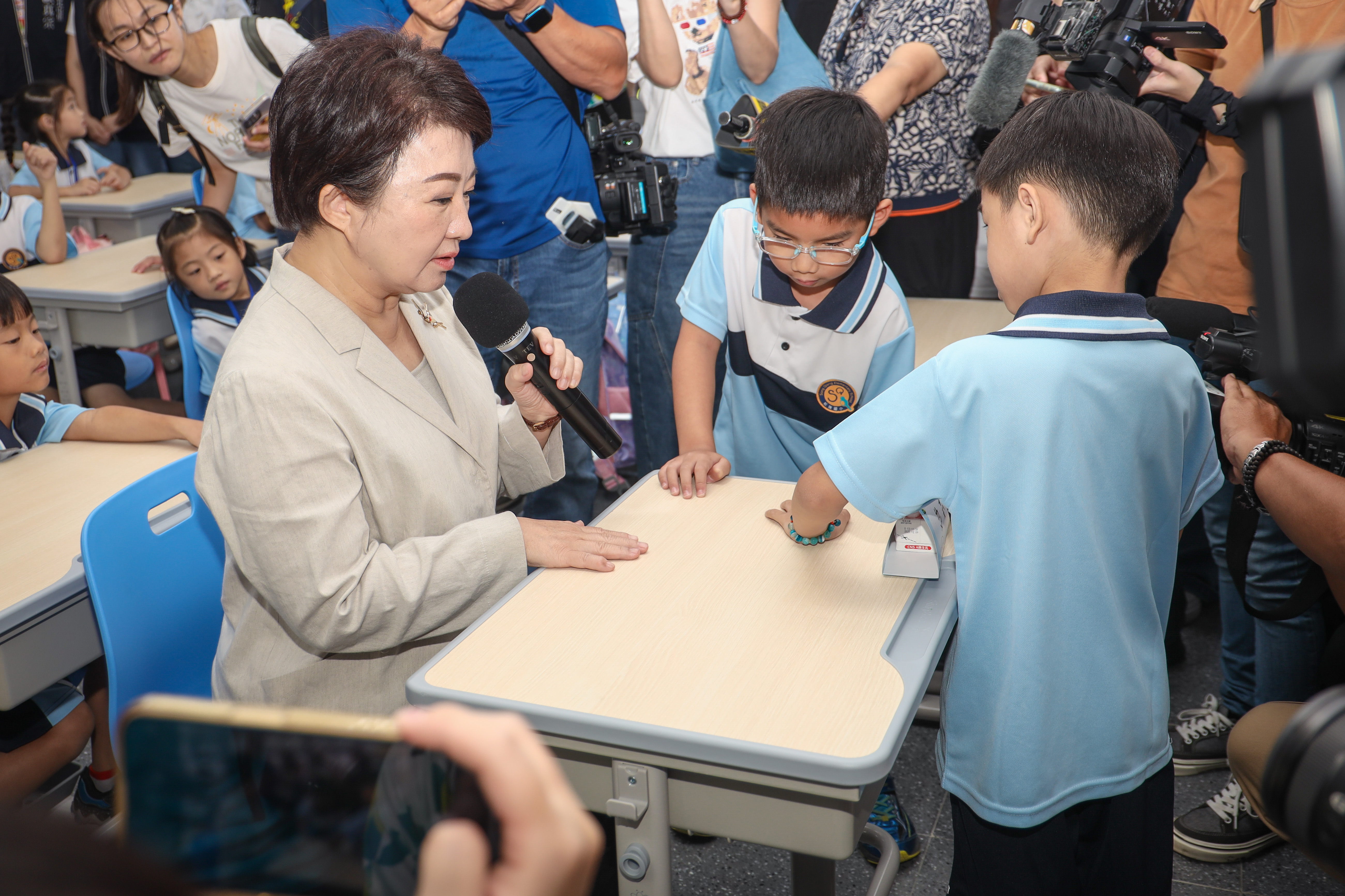 見證教育新頁!台中市新設的北屯區松強國小,市府全額補助興建工程達11億元,今(10)日舉行一期校舍落成典禮與二期校舍動土典禮。市長盧秀燕除出席時見證外,更視察松強國小可調式課桌椅使用情形。1年1班學童向盧市長介紹課桌椅使用方式,盧市長不僅仔細詢問孩子們的使用感受,並讚揚可調式課桌椅照顧孩子的視力和坐姿,提高學習專注力,提供孩子更優質的學校環境。