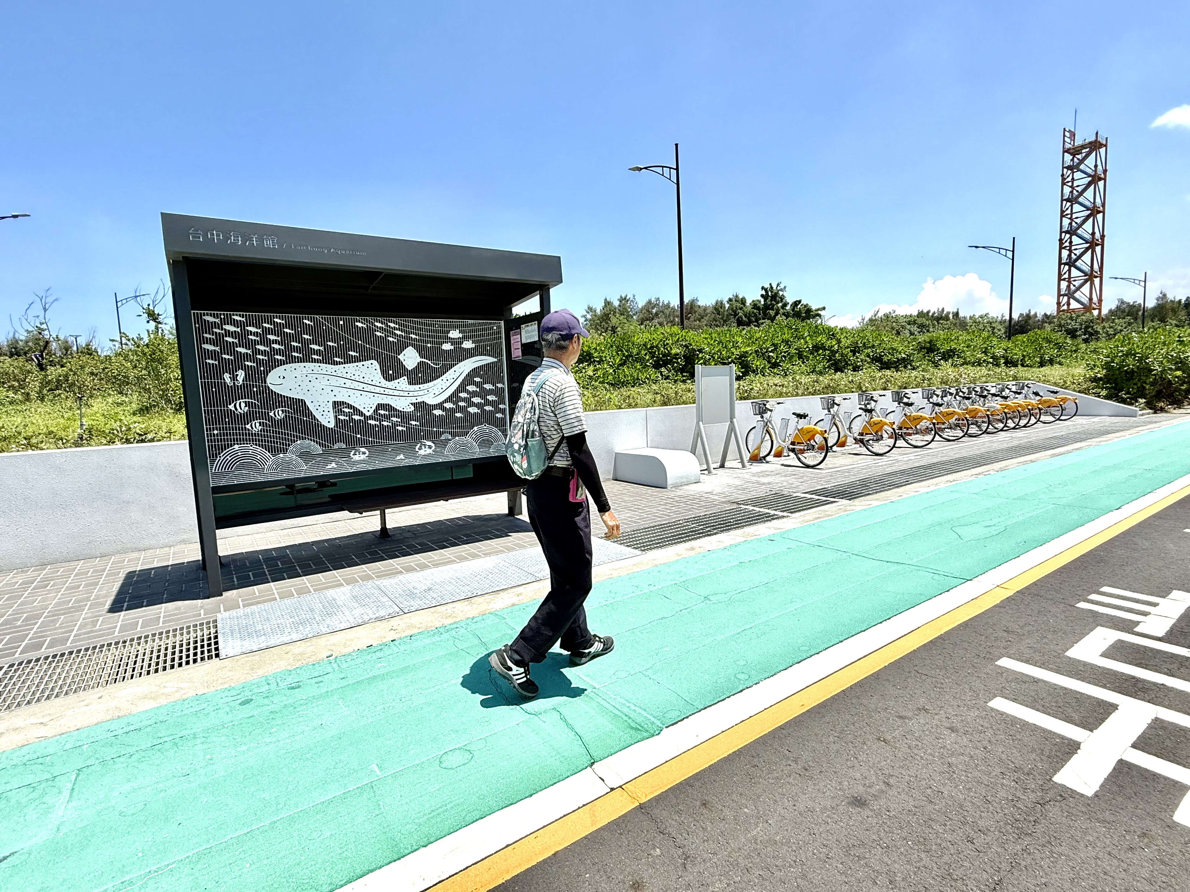 葉局長指出,特色候車亭提供遮陽擋雨空間,更是城市地景藝術。除了豹紋鯊候車亭,海線還有另外兩個人氣站點,大甲火車站前的老榕樹意象候車亭,用榕樹葉創造出樹屋造型,等車時像在大自然裡乘涼。另一座台中港旅客服務中心前設置的梧棲轉運節點,水藍色候車長廊為主題設計,搭配不「藝」樣的孔雀藍貨櫃,交通結合休閒的公共設施,被稱為打卡必訪的海洋伸展台。