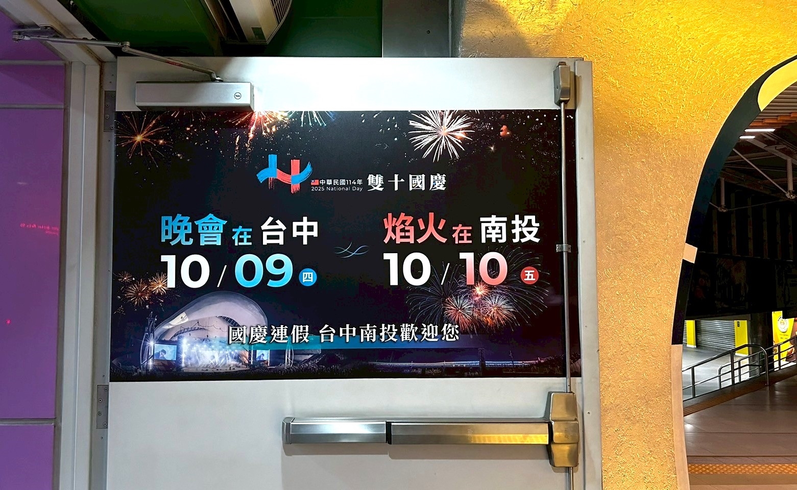 中捷公司指出,今年國慶「晚會在台中、焰火在南投」,勢必吸引全國及海外民眾齊聚中台灣,中捷特別從捷運高鐵台中站1號出口開始布置迎賓主視覺,並在月台門張貼醒目的晚會及焰火日期資訊,誠摯邀請所有旅客共襄盛舉。