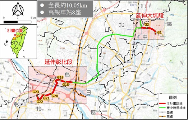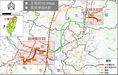 捷工局說明,綠線延伸線為既有捷運綠線兩端之延伸計畫,採全線高架設計,總長約10.05公里,共設8座高架車站,包括延伸大坑段 2.47公里、2站,以及延伸彰化段 7.58公里、6站。其中,延伸彰化段將從高鐵台中站銜接烏日高鐵特定區,並進一步延伸至彰化市區,最終串接彰化鐵路高架化新設的金馬車站,未來可望大幅提升中彰地區交通便利性。