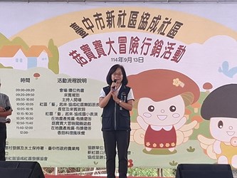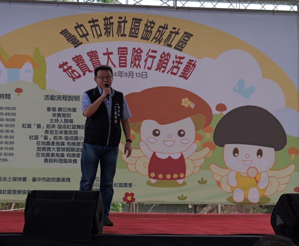 台中市政府農業局輔導新社區協成社區發展協會今(13)日上午在協成社區發展協會活動中心旁籃球場舉辦「菇寶寶大冒險行銷活動」,透過香菇知識闖關遊戲、農特產品展售及香菇風味料理,帶領大小朋友一起感受協成社區香菇產業的獨特魅力與熱情活力。
