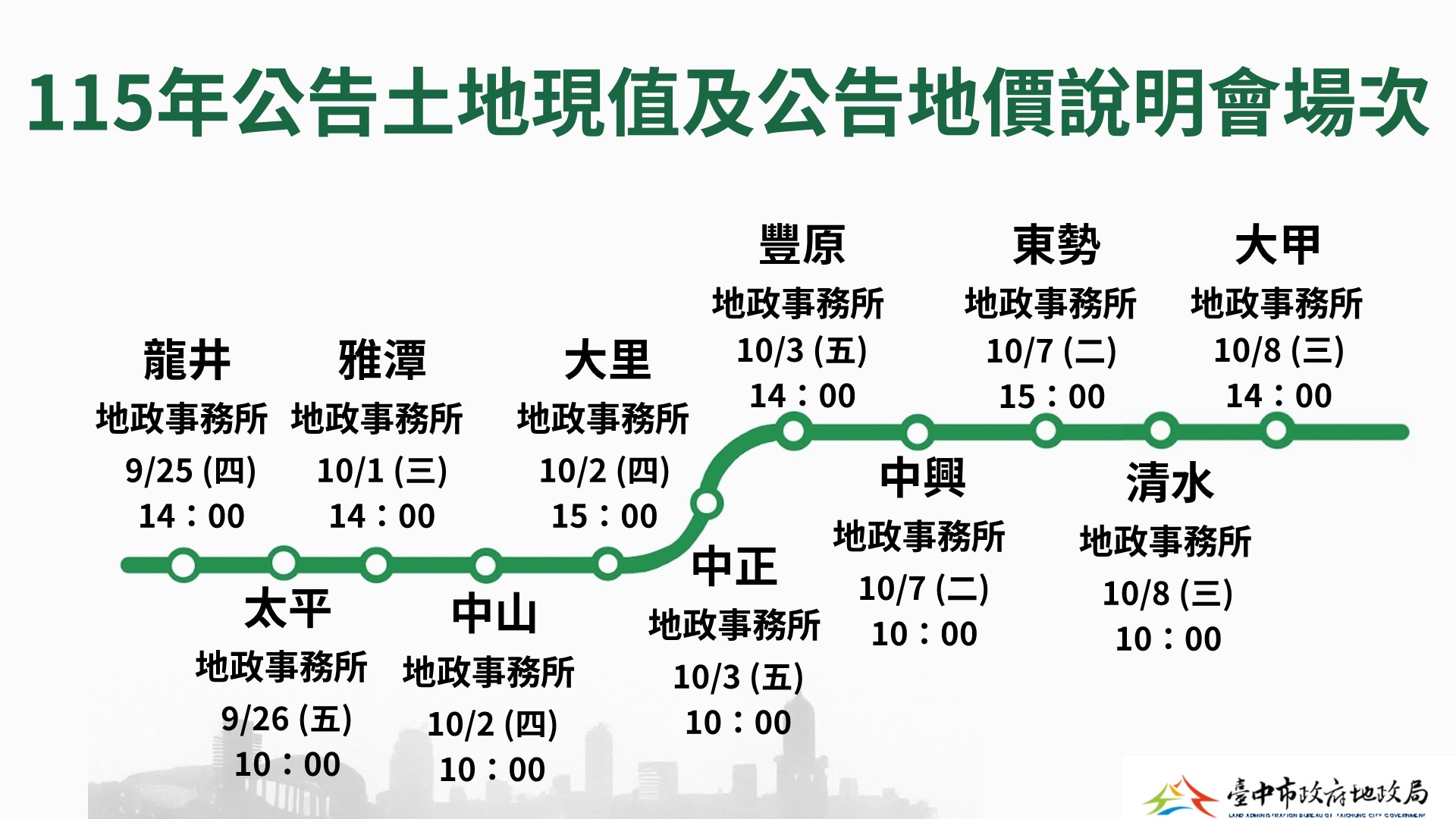 為確保地價調整作業公開透明並充分聽取各界意見,台中市政府地政局將於 114年9月25日至10月8日,陸續在全市各地政事務所舉辦 11場「115年公告土地現值及重新規定地價」公開說明會,邀請市民及相關團體參加,為建立公平合理的地價環境提供建議。