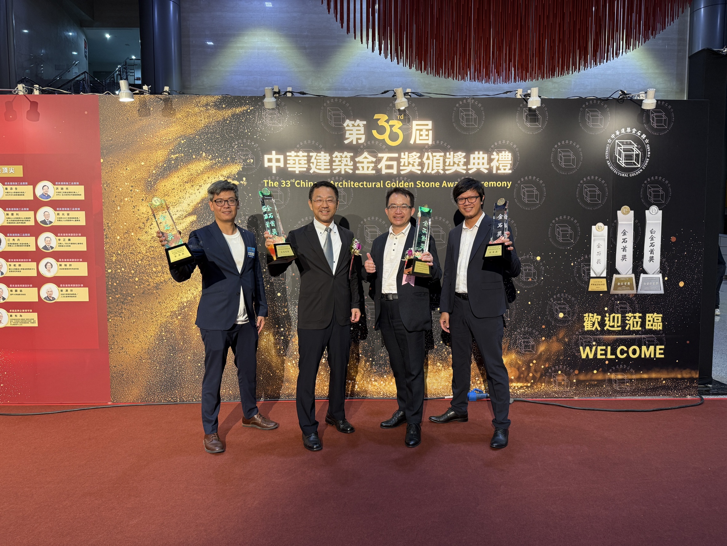 第33屆中華建築金石獎昨(15)日晚間舉行頒獎典禮,台中市政府建設局以「台中市巨蛋體育館興建工程」及「台中市太平國民暨兒童運動中心興建工程」分別榮獲優良公共建設及優良空間活化類金石獎「首獎」肯定,一舉創下首次獲得雙首獎的輝煌榮耀;頒獎典禮由建設局副局長陳永欣代表局長陳大田出席受獎,持續以優質建設提升公共環境、促進區域均衡發展,強化工程管理,為台中打造幸福宜居城市,塑造美好未來。