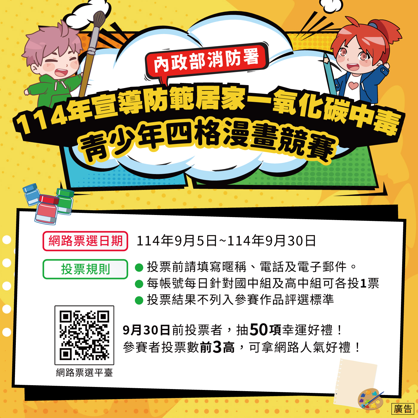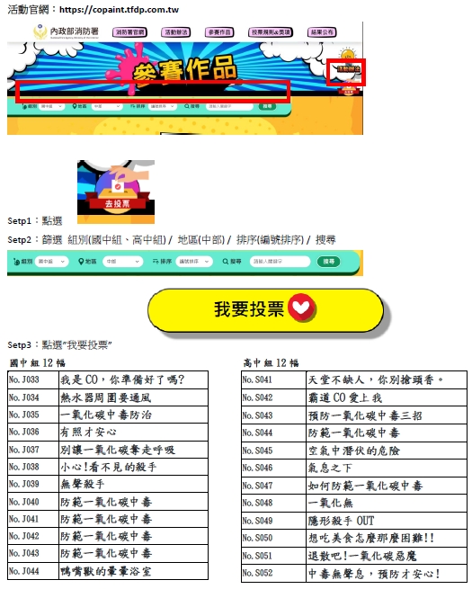 消防局說明,為鼓勵參賽學生,內政部消防署特別辦理「網路人氣票選」活動,透過全民參與支持,讓更多人看見青少年對防災教育的用心與創意。消防局籲市民朋友踴躍上網投票,支持中市參賽學生作品,為台中爭取佳績、為孩子們加油打氣。投票活動期間,凡參與投票者還有機會參加抽獎,獲得精美好禮。投票不僅能肯定學生們的創作努力,更能共同推廣「正確安裝燃氣熱水器」及「預防一氧化碳中毒」的重要觀念,守護每個家庭的安全,活動官網( https://copaint.tfdp.com.tw )。