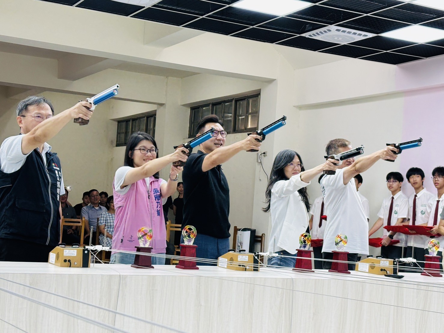 今日典禮,立法院副院長江啟臣、市議員張廖乃綸、市議員吳振嘉助理、立法委員蔡其昌服處主任、學校家長會長等到場共襄盛舉,並共同為射擊場進行揭幕剪綵儀式。(9/17*11)*教育局