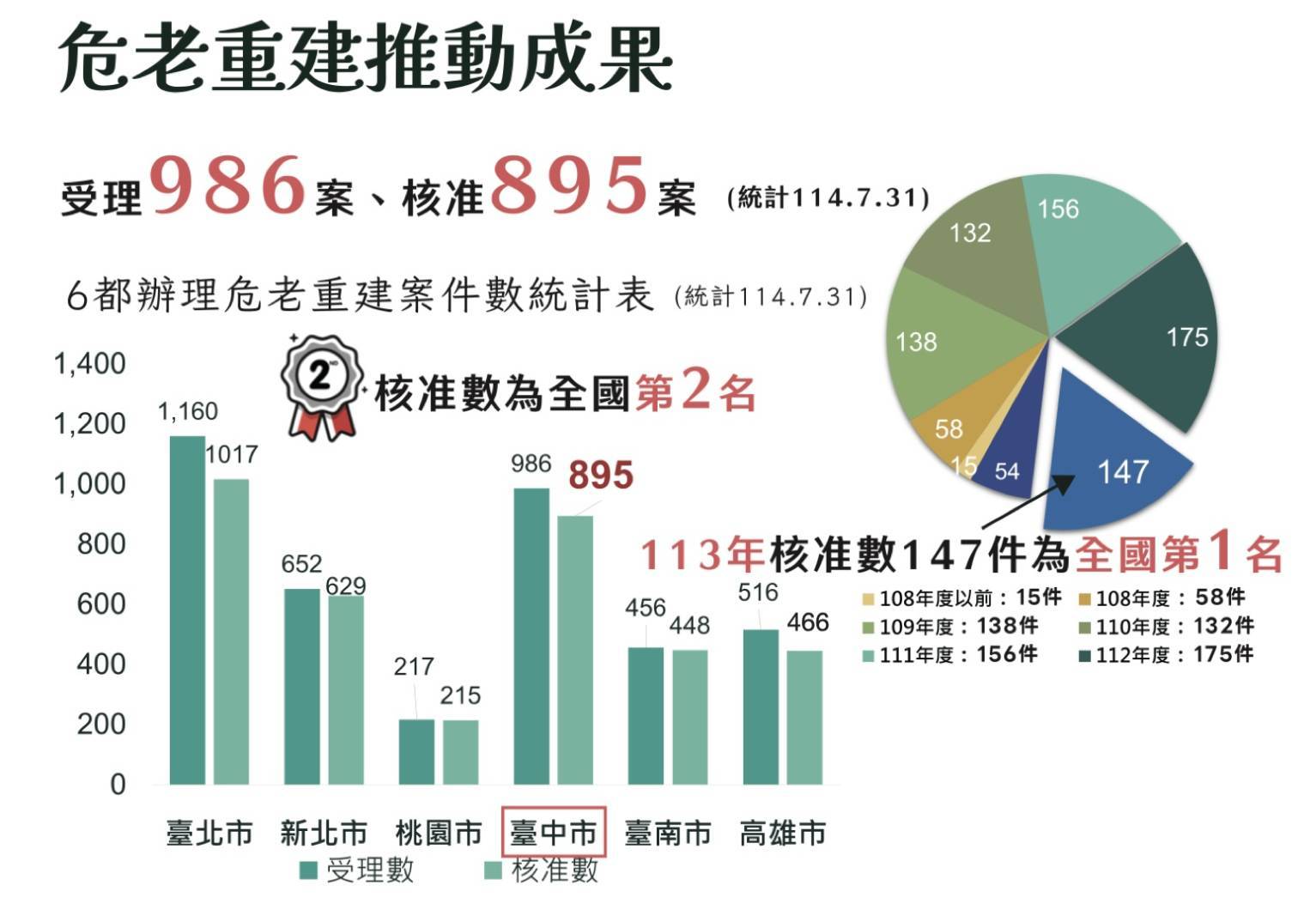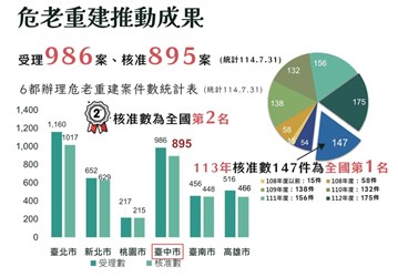 都發局指出,在盧市長支持和帶領下,台中市危老重建推動成果卓越,統計至今年7月31日受理986案,核准共計895案,核准件數已達全國第2名,113年度當年度核准147案,為全國第1名,致力於推動老舊建築物加速更新。