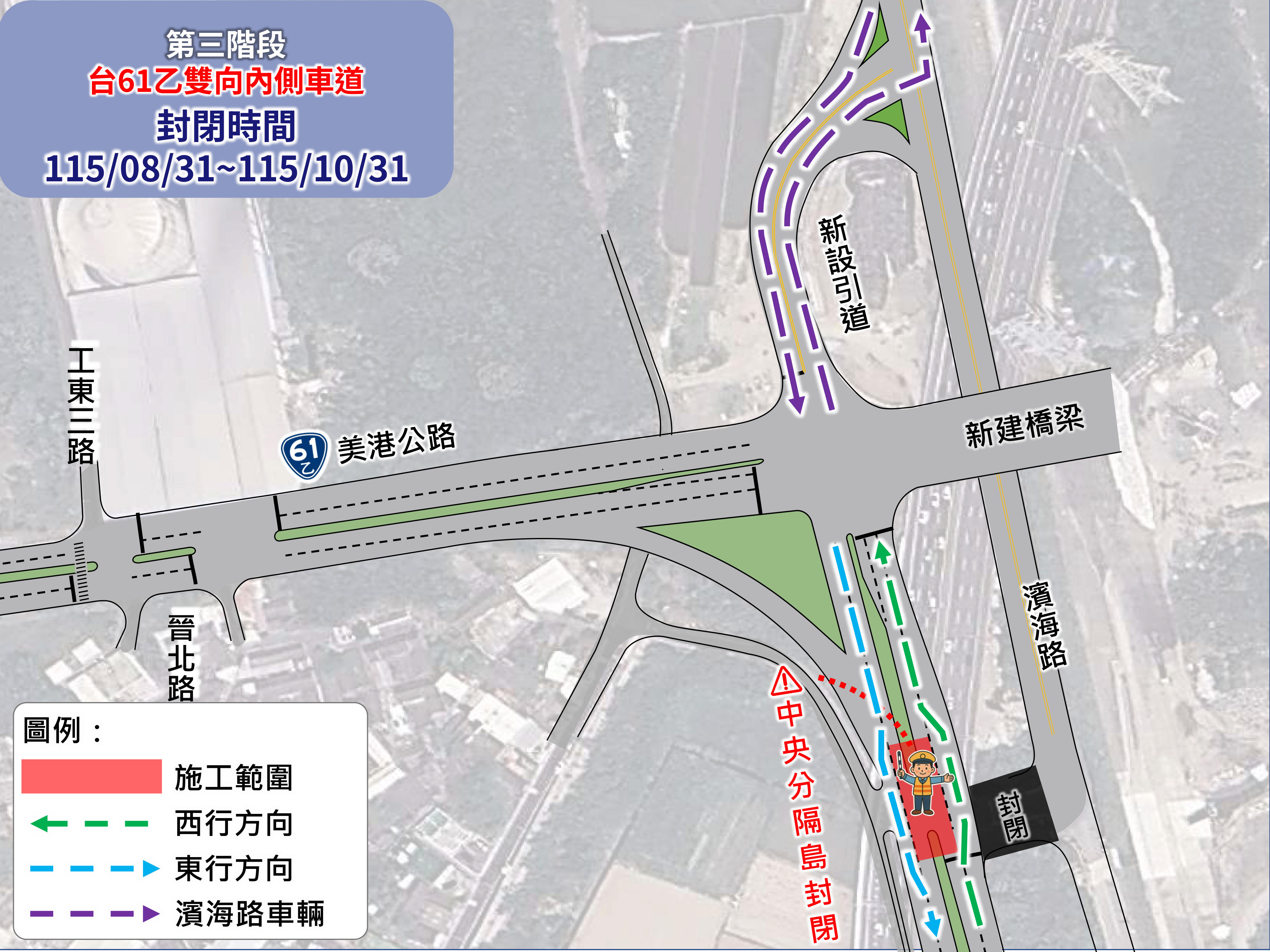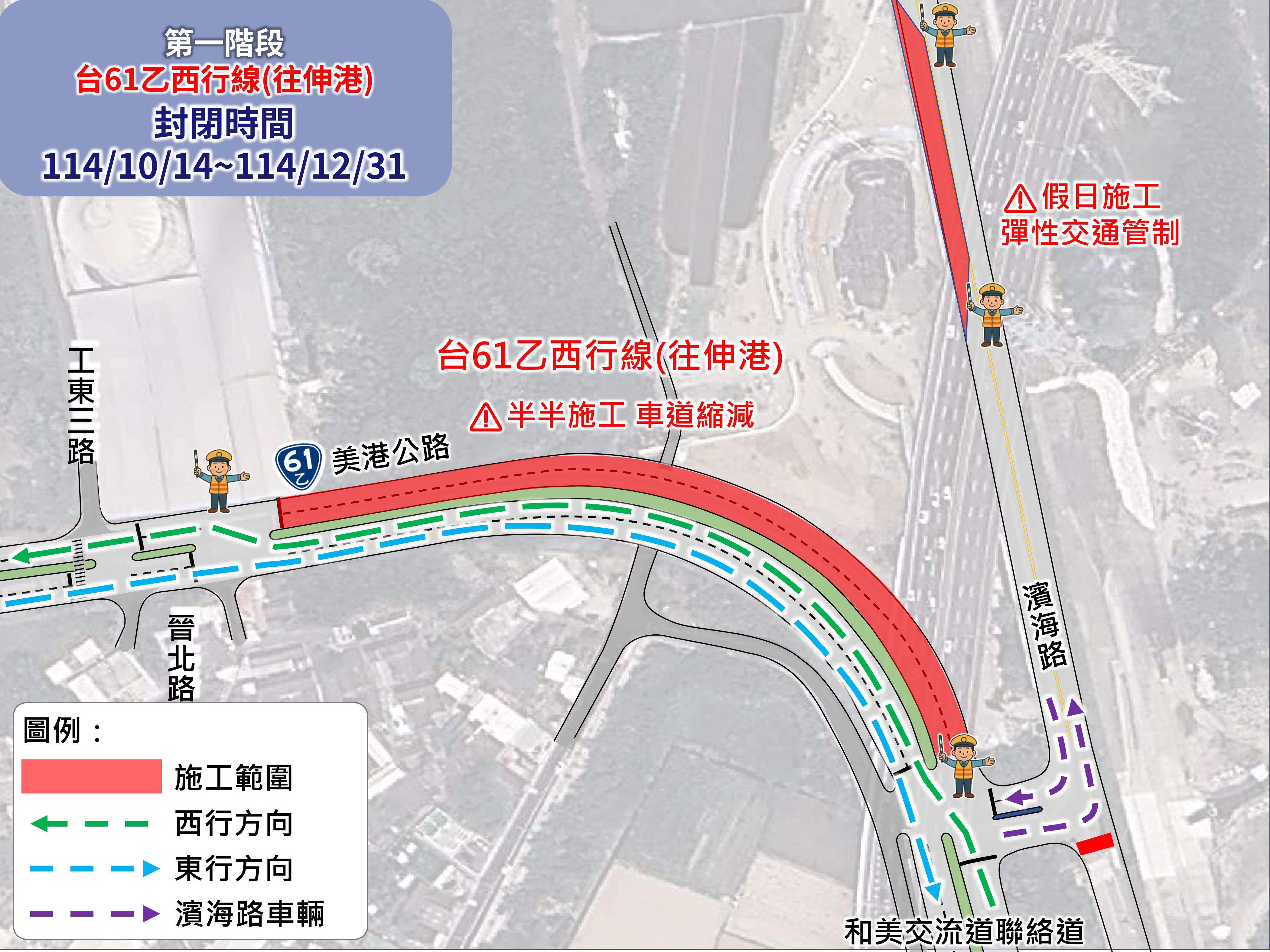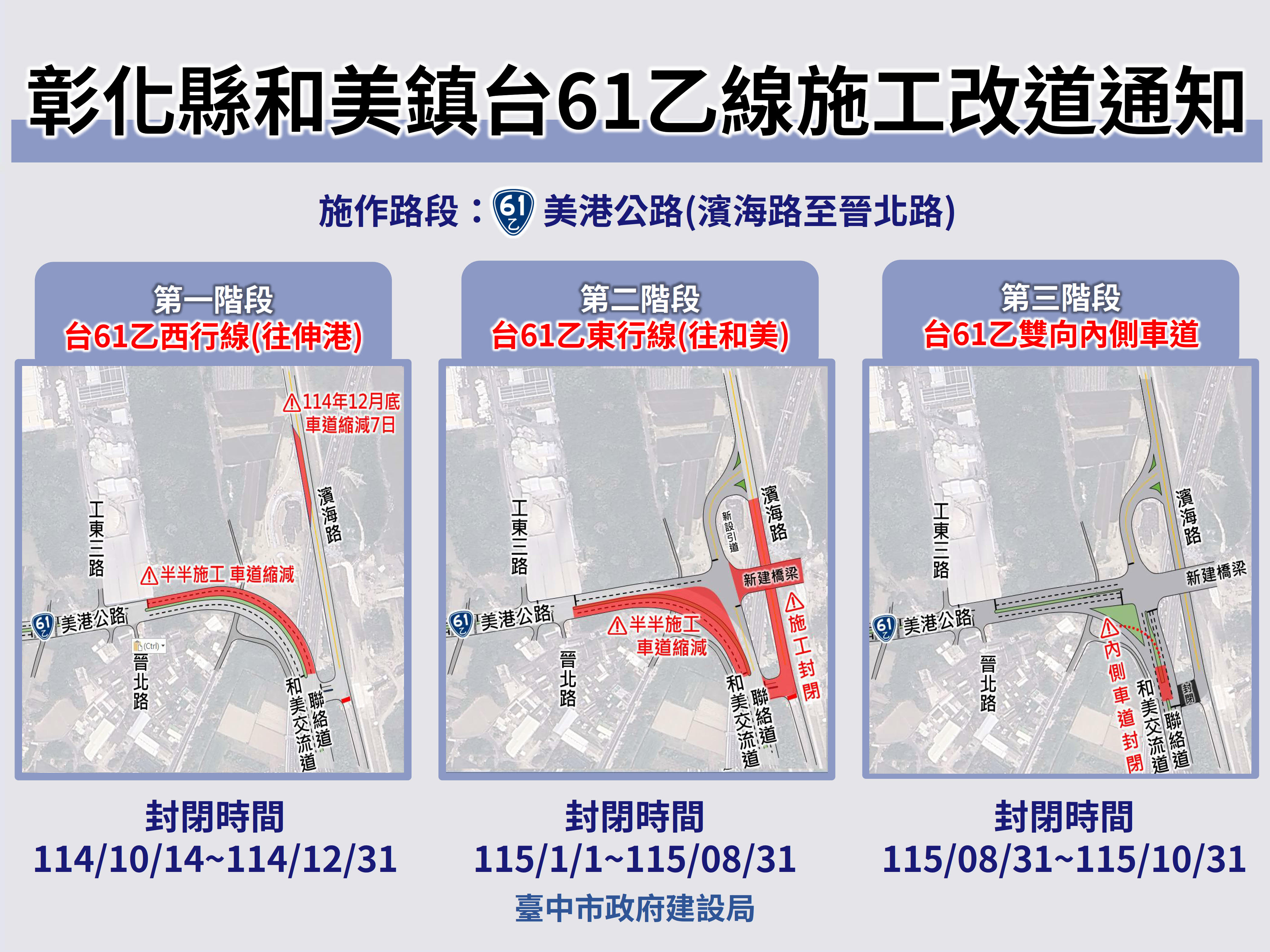 串連兩縣市重大交通動脈「台中大肚-彰化和美跨河橋梁新建工程」,台中市府建設團隊推動至今進度已近8成,為完善彰化和美端橋梁引道施工,市府建設局啟動三階段交通管制措施,其中第一階段自1141014日至1141231日,將封閉台61乙西行線(往伸港方向),並改道至東行線原雙車道調整為「雙向各一車道通行」,請用路人務必注意改道資訊以利通行順暢。