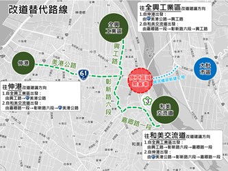 建設局指出,第一階段將封閉台61乙西行線(往伸港方向),並將東行線原雙車道調整為「雙向各一車道通行」;另濱海路近國道三號橋下,將於12月中下旬封閉部分南下路段,並改至北上路段採取雙向管制、彈性輪流通行。建設局提醒用路人可參考建議改道路線(詳見改道替代路線圖),提前規劃行程,避開易壅塞區域,並遵守現場管制引導,減速慢行,注意行車安全。