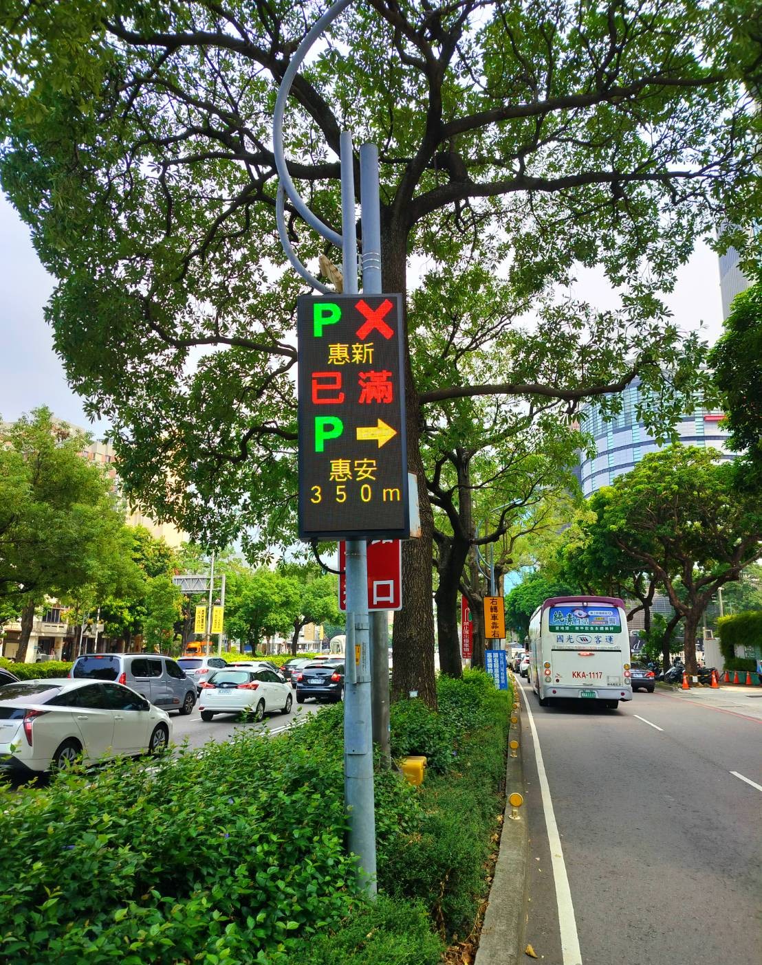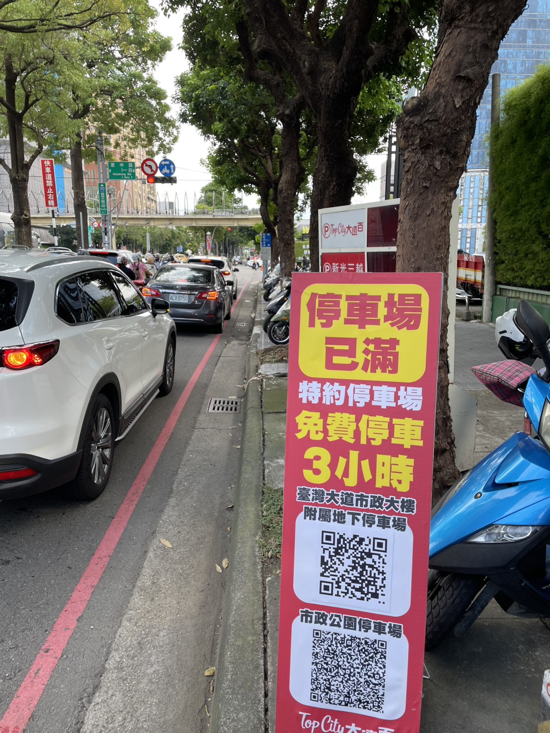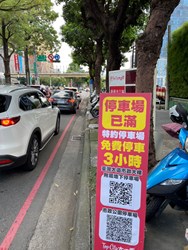 同時,道路側已佈設相關指引牌面外,並於停車場近滿場時,搭配「停車場已滿,特約停車場免費停車3小時」及停車導引QRcode等告示牌面,有效引導用路人前往周邊特約停車場停放,紓解車輛佔用道路困境。