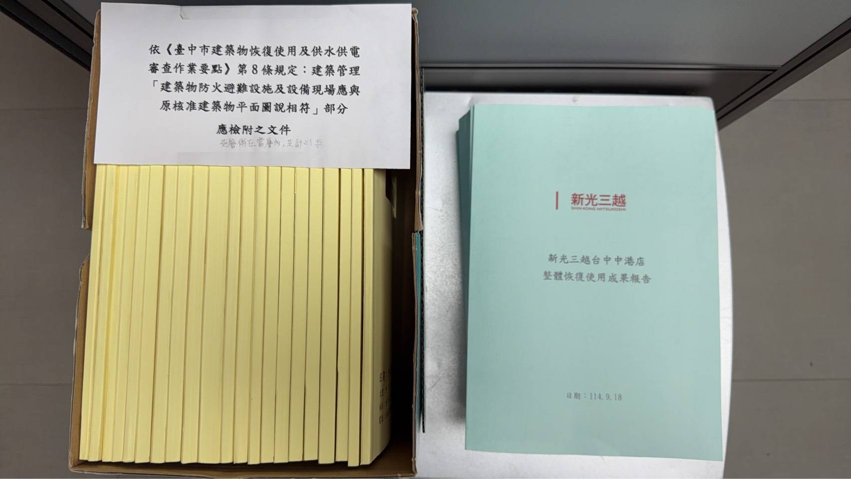 台中市政府表示,查新光三越百貨(中港店)完成室內裝修、變更使用及整建修復經各專業技師簽證、第三方公正單位認證及都發局委託的第四方專業機構分層勘驗完成,前依規於9月18日備齊文件向都發局提送恢復使用申請,經台中市政府各機關(都發局、消防局、經發局等)進行審查後,確認符合各權責法令規定及程序,於9月26日准予恢復使用。