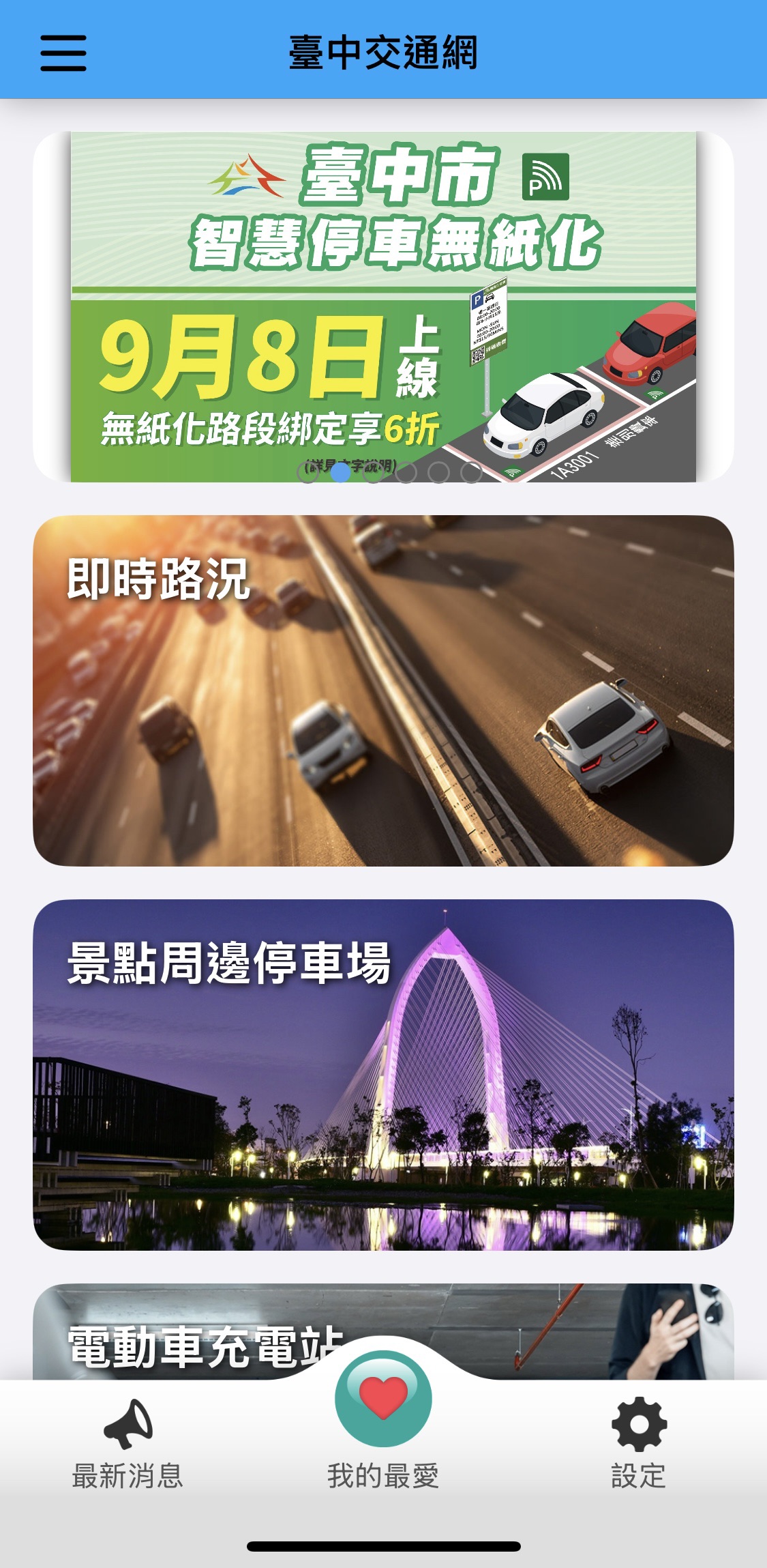 交通局呼籲市民朋友,因應教師節、中秋節與雙十國慶假期,用路人可提前查詢路況與替代道路資訊,並歡迎民眾下載「台中交通網」APP (https://reurl.cc/43QEMV),一機在手,路況、停車、公車及充電資訊一應俱全,是您假期旅遊、返鄉與購物的最佳出行夥伴。