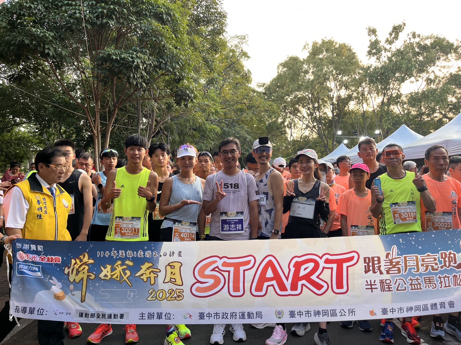 伴隨夕陽餘暉、晚風徐徐,台中市政府運動局與神岡區體育會共同主辦的「114年運動i台灣2.0計畫—神岡區嫦娥奔月馬拉松嘉年華」,昨(27)日晚間於潭雅神綠園道熱鬧開跑。由藝人謝忻、「神岡安心亞」KIKI及日本跑者TOMO領跑,現場吸引近千名跑友與市民參與,隨著中秋佳節將至,賽事更添溫馨浪漫氛圍。