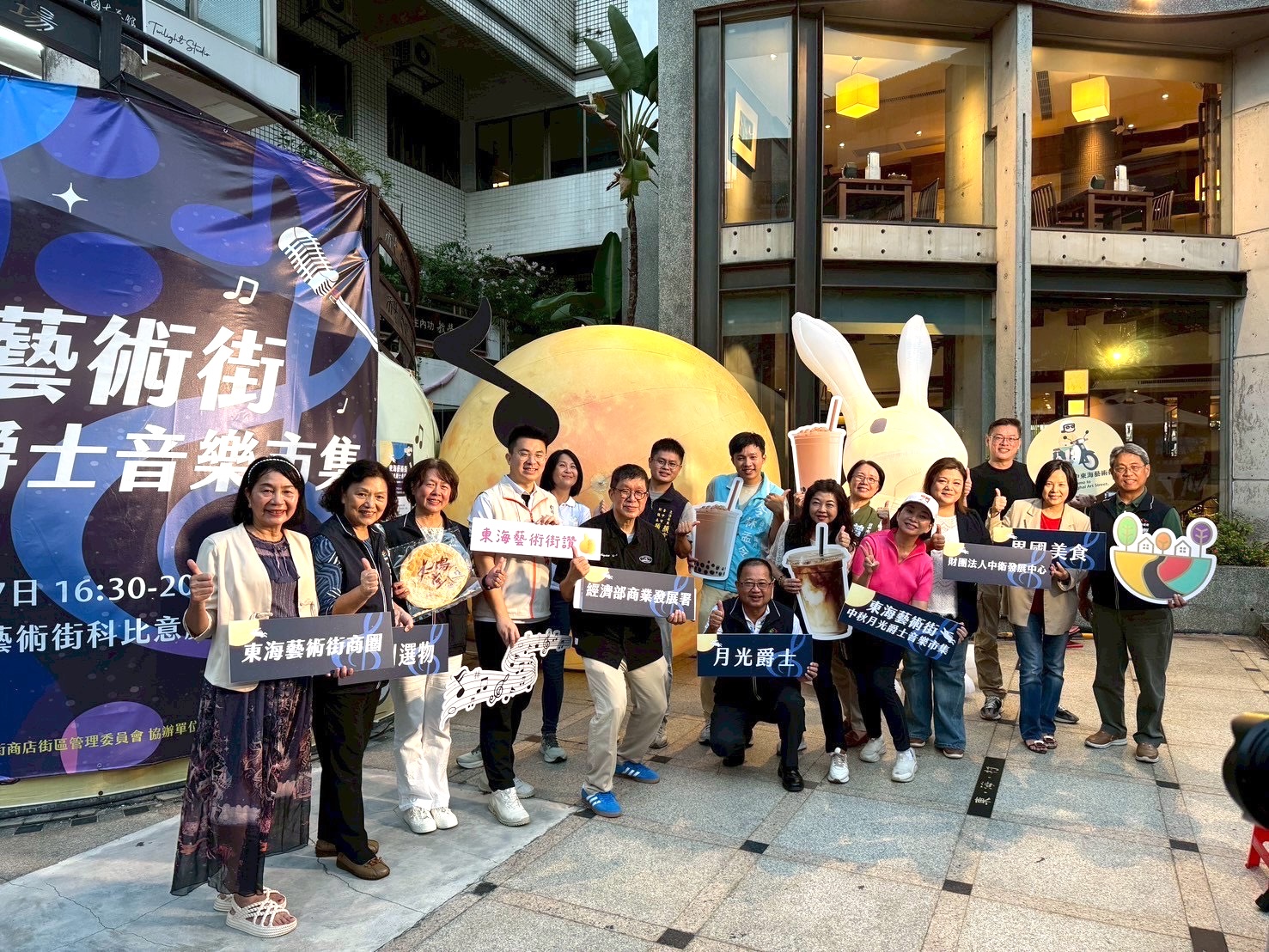 東海藝術街商圈主委郭達鴻表示,中秋不只烤肉賞月,更能在「中秋月光爵士音樂市集」享受別具氛圍的體驗。現場攤位包含 Runaway vn coffee、印度市集、港頌、小驢子、阿育咖哩、爾雅茶堂、OUR FUN 等人氣品牌,民眾消費滿額或參加打卡互動,就有機會獲得超人氣「30公分太陽酥餅」或中秋限定好禮。加入商圈 LINE 好友,還能領取專屬優惠券。此外,現場設置可愛的「巨型月亮與兔子」裝置藝術,成為打卡拍照的熱門景點,讓大家留下美好中秋回憶。