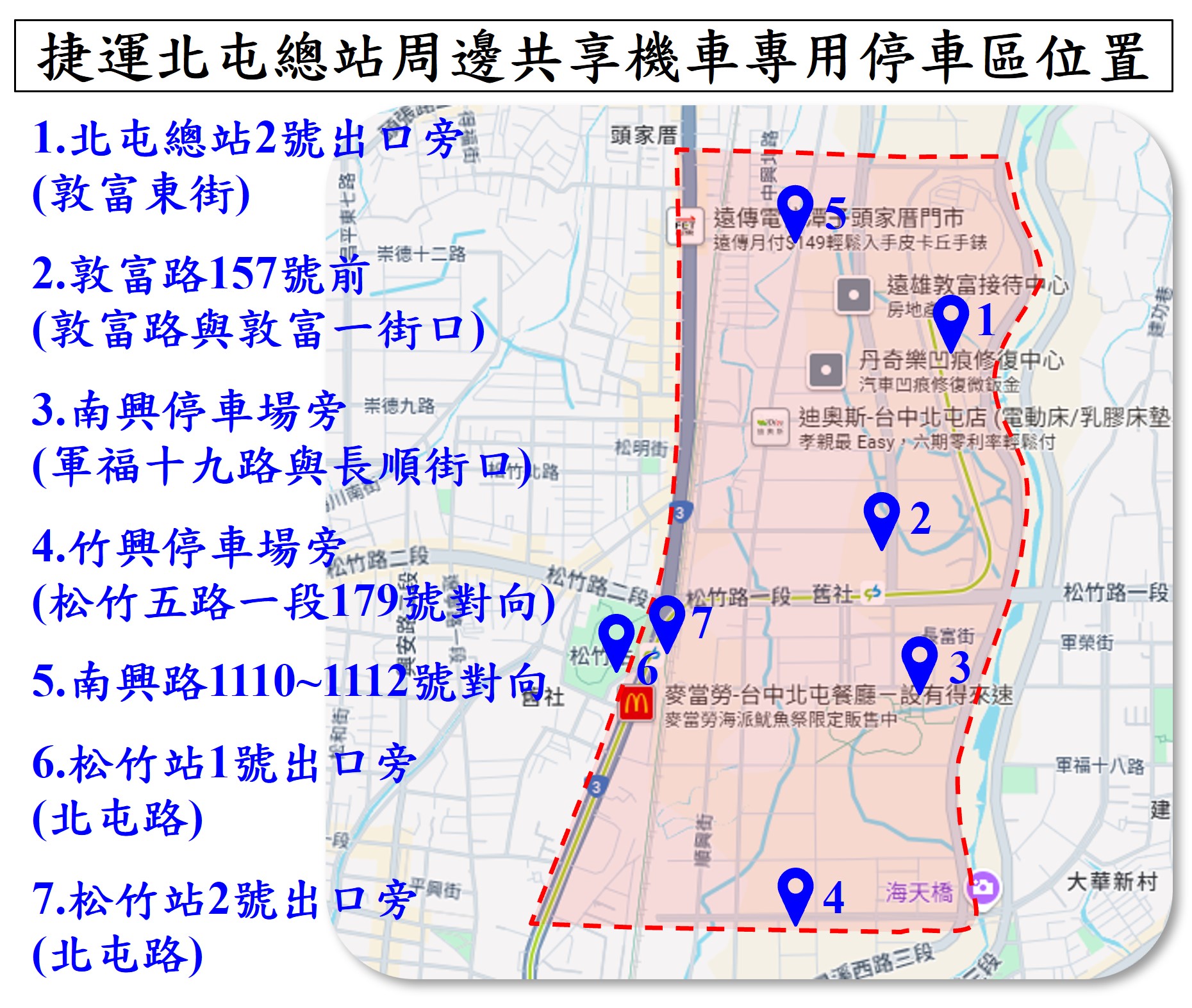 推動低碳交通、落實「2050淨零排放」願景,台中市政府積極爭取交通部運輸研究所的支持,自10月3日至11月30日試辦共享運具連結公共運輸示範計畫,成為全國首個獲推薦參與的城市。台中市政府交通局長葉昭甫表示,選定鄰近捷運、台鐵及社區密集的烏日區三和里、榮泉里、湖日里(捷運高鐵台中站周邊),以及北屯區舊社里(捷運北屯總站周邊)試辦,設置共享機車專用停車格,發放騎乘優惠券,鼓勵市民及旅客享受無縫轉乘大眾運輸的便利選項。