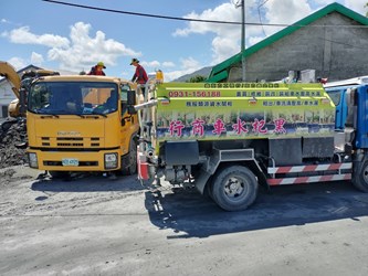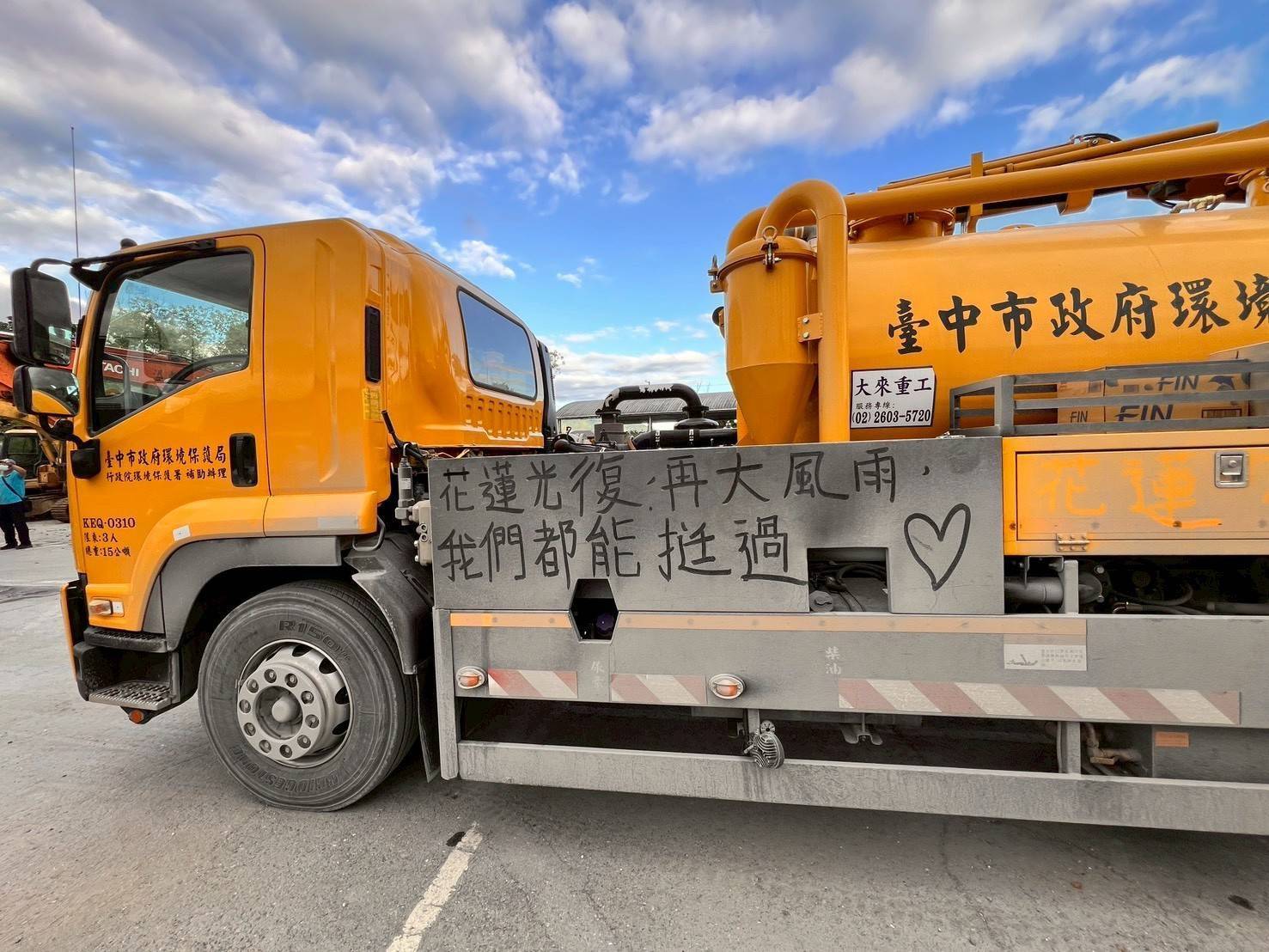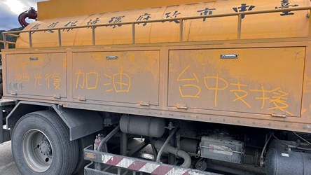 環保局補充說明,現場取水點有限,補水往返耗時,所幸有民間夥伴「鑫友力工程」加入,出動灑水車現場支援,不僅協助民眾取用,也提升整體作業效率。值得一提的是,經過一天與塵土疲累奮戰後,隔天環保局清潔同仁發現挺進協助沖洗民宅的清潔車輛上,有熱心民眾特意在車身灰白塵土上寫下「再大風雨我們都能挺過 ! 光復加油 台灣加油」,令人為之動容,也讓在烈日下奮戰的清潔隊員深受鼓舞。