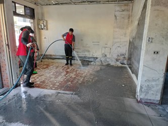 環保局大隊長邱雅琳表示,日前清理民宅獲得居民好評,吸引鄰近居民前來預約支援。團隊兩日已完成 9 戶民宅及 1 間農機行清理。面對牆面高達一層樓的淹水痕跡及厚重污泥,環保局調派清溝車與灑水車強力沖洗,再由同仁化身「刷子超人」、「刮水超人」合力清潔,總計完成約 5,200 平方公尺清理,協助居民家園逐漸恢復整潔。