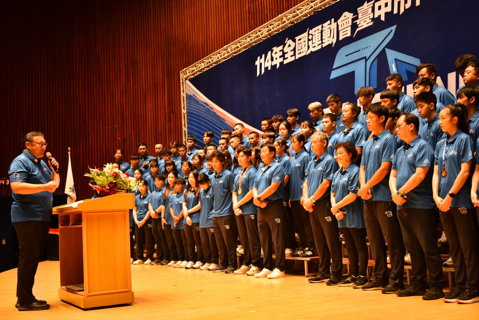 典禮中,台中市體育總會秘書長蘇柏興代表議長張清照致贈30萬元加菜金,並加碼每面金牌獎金5萬元,期勉代表隊在本屆賽會「坐三望二搶第一」。蘇秘書長感謝所有教練與選手的辛勞,強調市府與體總將持續攜手,成為代表隊最堅實的後援,激勵大家全力拚戰、締造佳績。