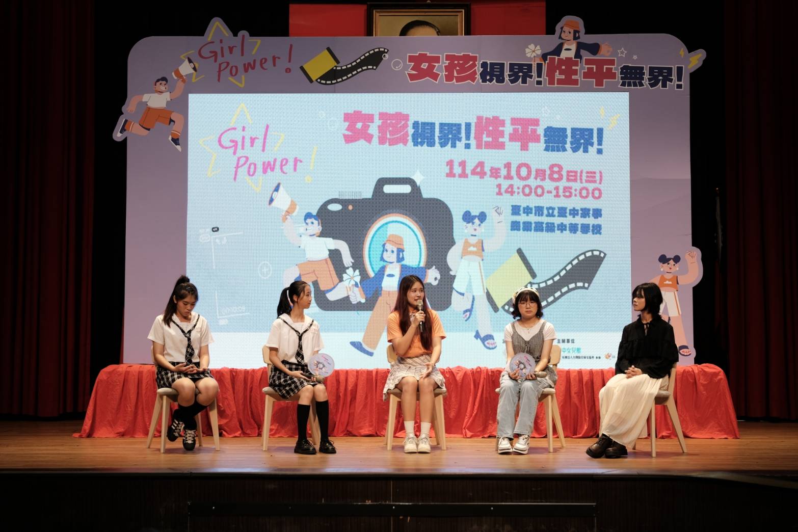 為響應10月11日台灣女孩日,台中市政府社會局舉辦亮點活動「影像發聲:女孩視界!性平無界!」,聚焦五大議題-女孩權益、校園霸凌與性騷擾防範、數位性別暴力、身體自主權及多元性別。今(8)日於台中家商舉辦頒獎典禮,邀請全校師生共同欣賞優秀作品,與得獎者交流分享創作歷程與心得。