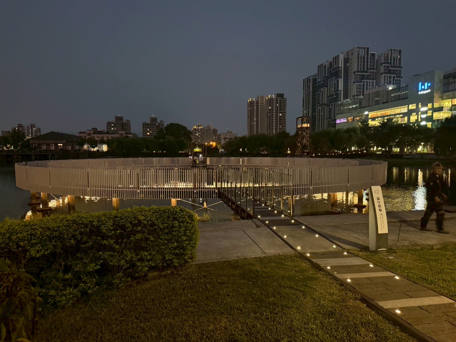 隨著夜幕低垂、園區燈光亮起,湖面光影與城市夜色相互輝映,讓來賓留下深刻印象。大島健資社長盛讚湧泉公園兼具文化、生態與都市滯洪功能,理念與日本推動的「韌性城市」概念相呼應,充分體現尊重自然、與環境共生的設計思維。
