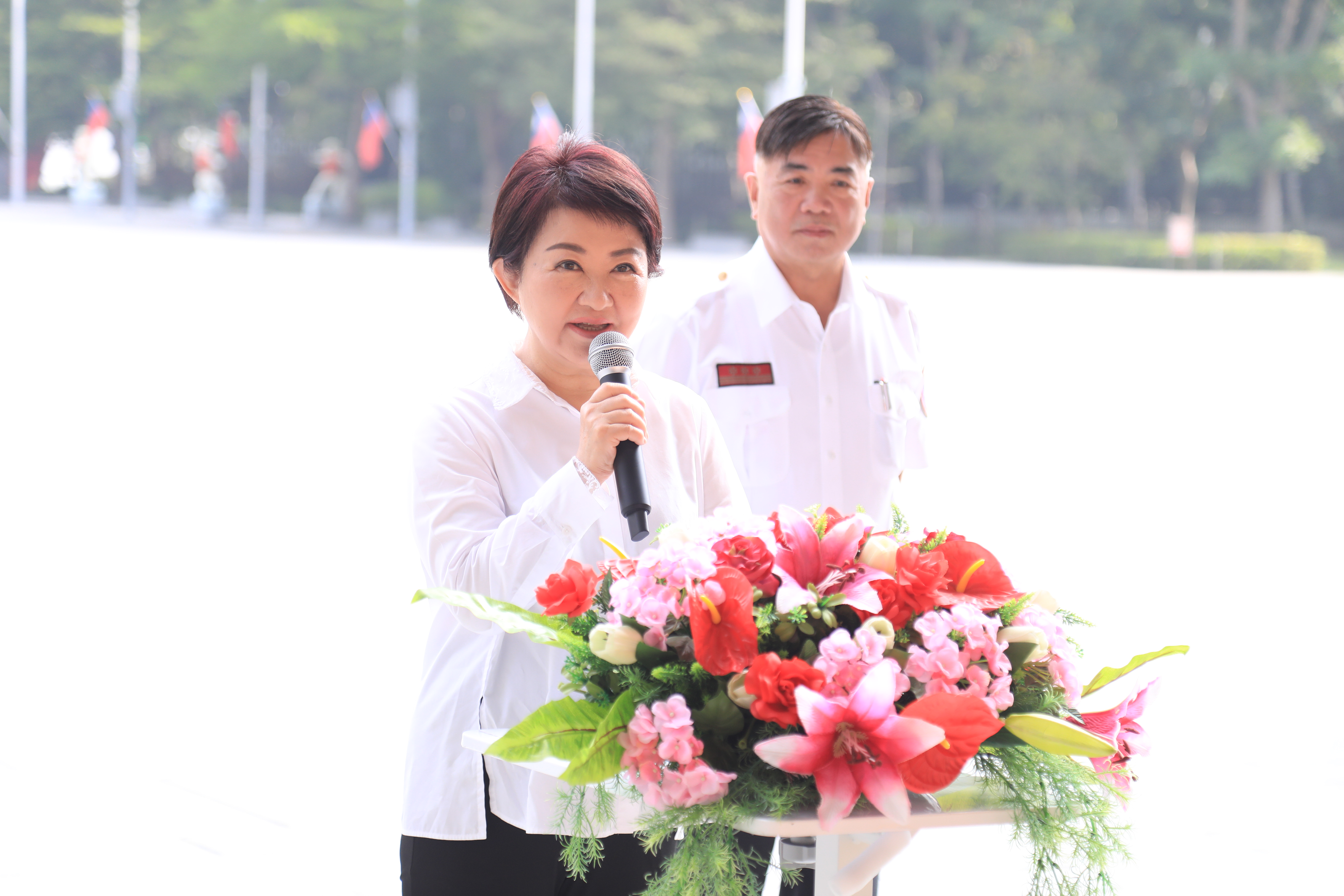盧市長表示,台中市政府消防局特種搜救隊是「台灣的英雄、台中的驕傲」,在花蓮光復鄉救災中展現專業、愛心與堅毅精神。她強調,授旗儀式象徵的不僅是榮譽,更是責任與使命。她感謝隊員無私奉獻,並親自授旗致敬。她指出,台中搜救隊不僅在國內多次救災,亦具土耳其國際救援經驗,能力全國數一數二。此次出發參與國際重型認證,包含104名成員、醫師、技師與搜救犬,期勉順利通過認證,持續守護市民安全。