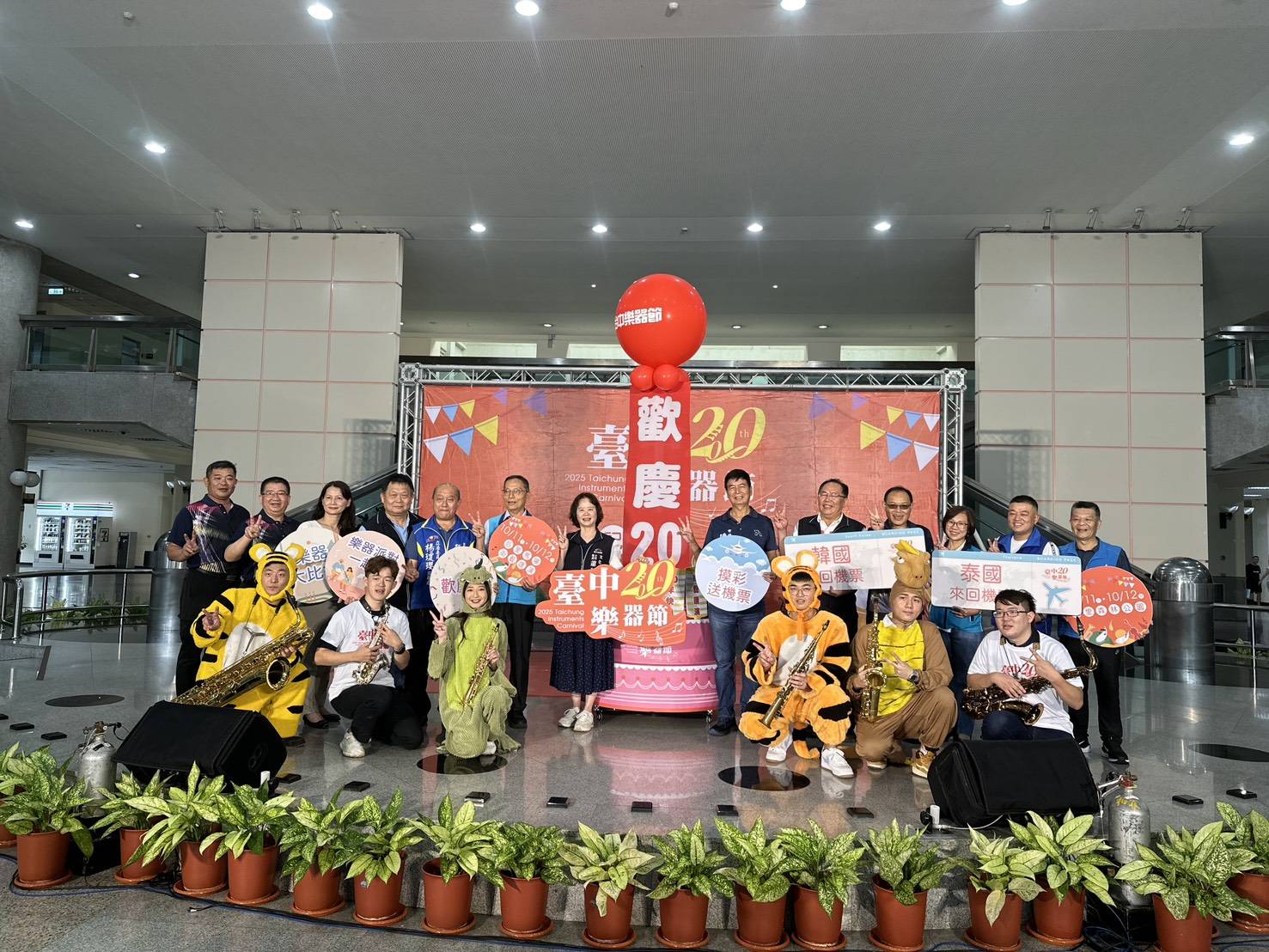 「2025台 中樂器節」記者會今(25)日下午於市府陽明大樓舉行,為活動邁入第20週年揭開序幕。現場特別邀請在地樂團-后里愛樂薩克斯風重奏團,樂手們帶來四種不同聲部薩克斯風的精彩演出,除了展現薩克斯風演奏多層次的音色特色樣貌,更配合曲目以特色服飾裝扮共同歡慶台 中樂器節邁入20周年,將現場打造出「一起玩音樂,歡樂享盛會」的節慶氛圍。