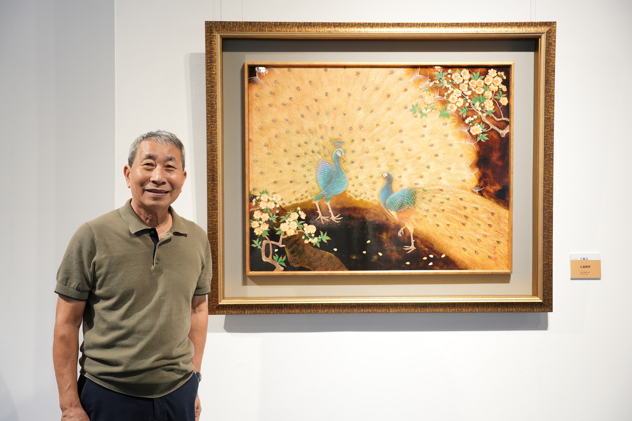 王老師說明,此次漆藝特展作品使用的技法之一「蒔繪」,為傳統漆工藝中的重要技法,源自古法「平脫」的精神,經改良後更趨精緻與典雅,可視為漆畫中的文人畫代表。作品〈高冠展翠〉便是大量使用此項技法,在磅礴大氣中呈現優雅精緻的細節,因此選擇此幅作品作爲展覽主視覺。