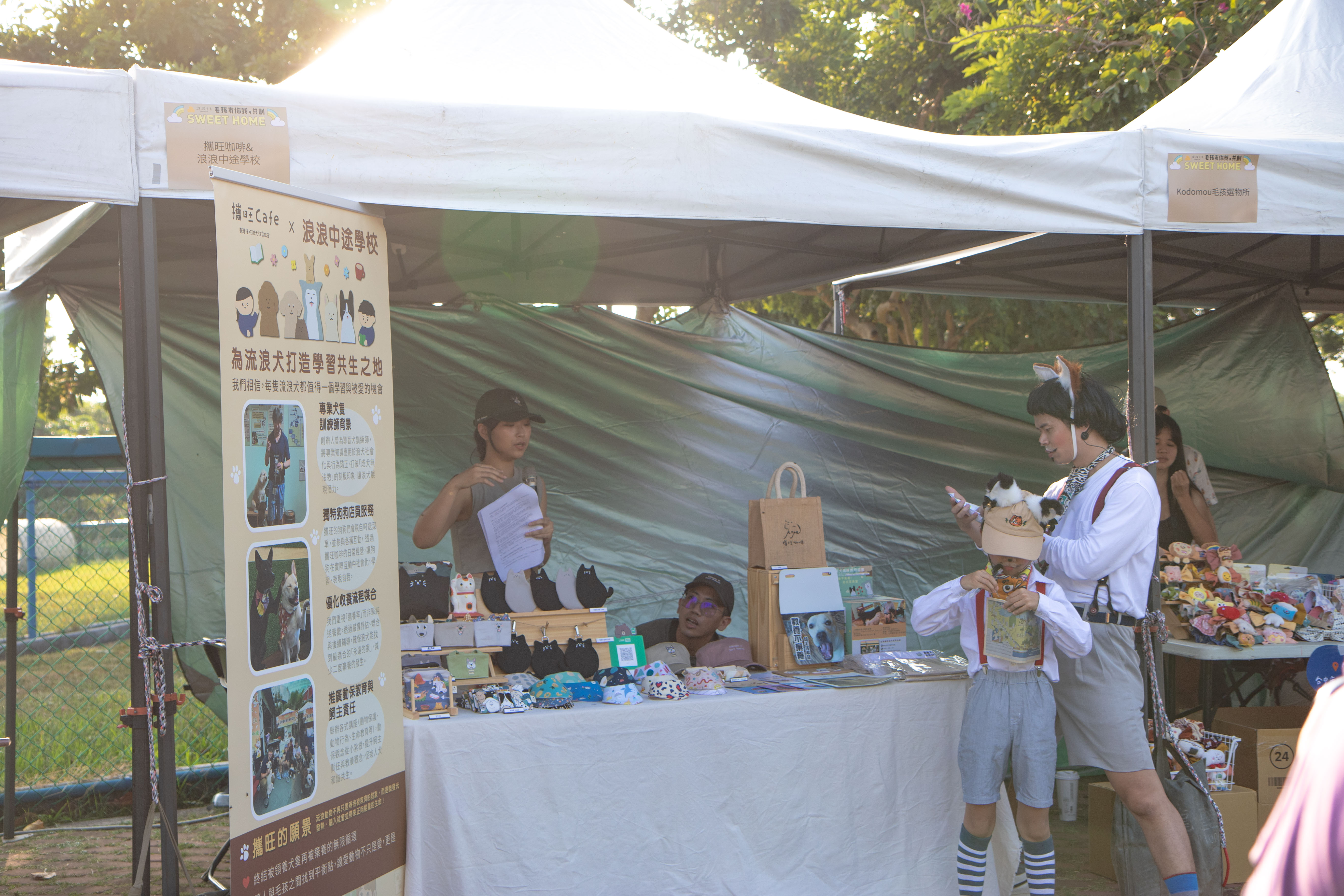 動保處特別邀請「禾作社劇團」帶來兩場精彩的環境劇演出,第一場演出帶領大家走進「動物之家后里園區」—這座被譽為「全臺最美動物收容所」的地方,正默默守護著無數等待新家的毛孩。透過戲劇的形式,市民朋友們將不只是觀眾,更是故事參與者,跟隨劇中角色的腳步認識園區,看見這些動物過往的經歷與對未來的期盼,等待有人牽起一生的緣分,給牠一個Sweet Home。第二場演出則聚焦在市集現場的公益攤位,劇團帶大家認識這些深耕在社會各個角落、長年致力推廣動物保護的民間團體。他們如同守護生命的光,日日努力不懈,堅持為不會說話的動物發聲,點亮社會的同理心。環境劇像是一座橋梁,讓觀眾更加理解公部門與民間團體的公私協力合作,是讓城市更友善對待動物的重要力量。