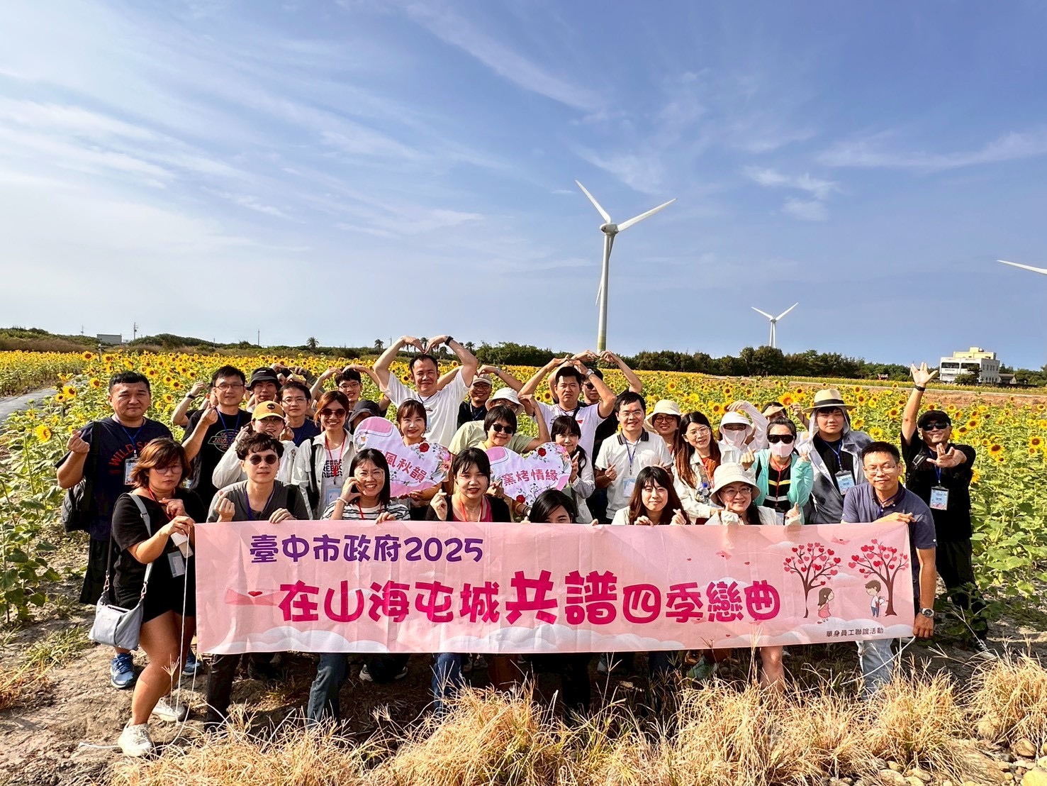月老秋陽照葵田!台中市政府今年第三場單身公教員工聯誼活動「海風秋韻~初秋窯烤情緣」於昨(19)日在大甲區葵海休閒農場熱鬧舉行,36位單身男女在充滿海線風情的氣氛下揭開幸福的序幕。活動以控窯及手作體驗為主軸,讓單身同仁在海風徐徐的自然環境中,能夠輕鬆自在的認識彼此。台中市府人事處長陳月春特別出席活動,為參加同仁加油助攻,在向日葵花海及大風車的見證下,成功促成7對有緣同仁互表心意。