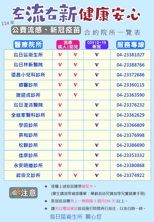 (更新)114年烏日區公費流感及新冠疫苗合約院所一覽表。