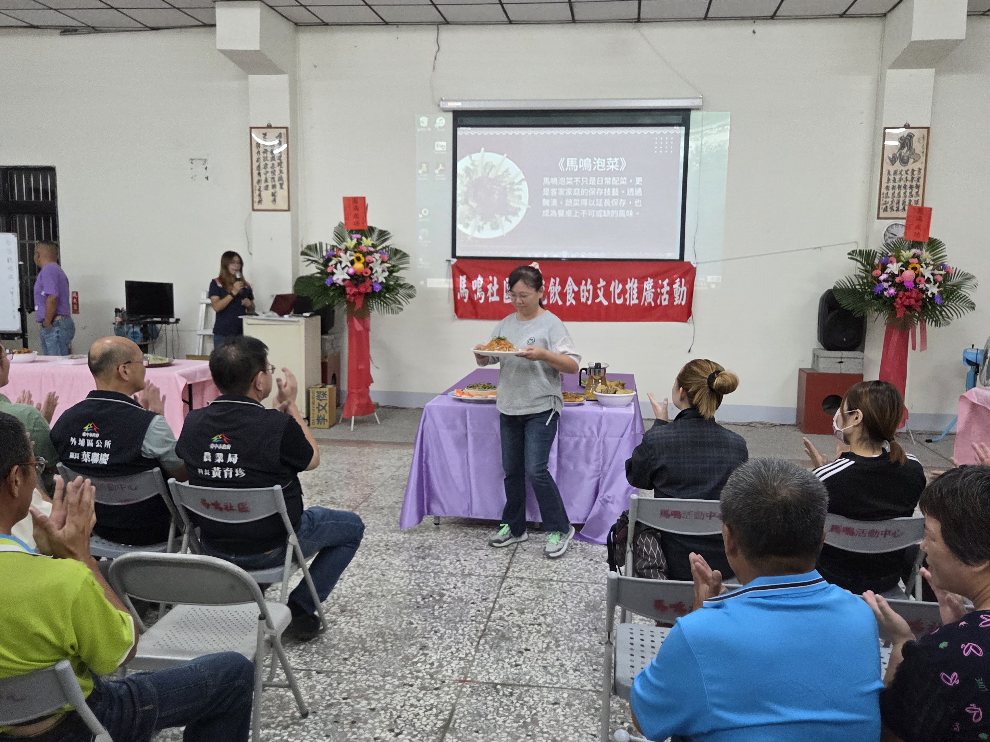 農業局指出,馬鳴社區主要以農業為核心,種植稻米、芋頭、蔬菜與茭白筍等農作物,社區運用在地食材辦理食譜開發研習課程,邀集居民重現辦桌菜與割稻飯的古早風味,讓長輩的手藝與故事得以延續。活動也透過飲食文化推廣成果展,以「吃在地、傳文化」為核心精神,展示地方特色料理及健康飲食創意料理。