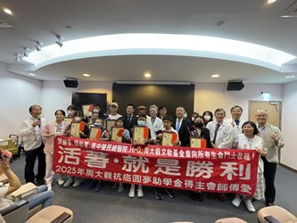 台中市政府教育局局長蔣偉民今(27)日上午親赴台中榮民總醫院,出席由財團法人周大觀文教基金會舉辦的「2025年周大觀抗癌圓夢助學金」頒獎典禮,頒發助學金給台中市的獲獎學生,為這群生命鬥士們加油打氣,並肯定他們不向病魔低頭的勇敢精神。