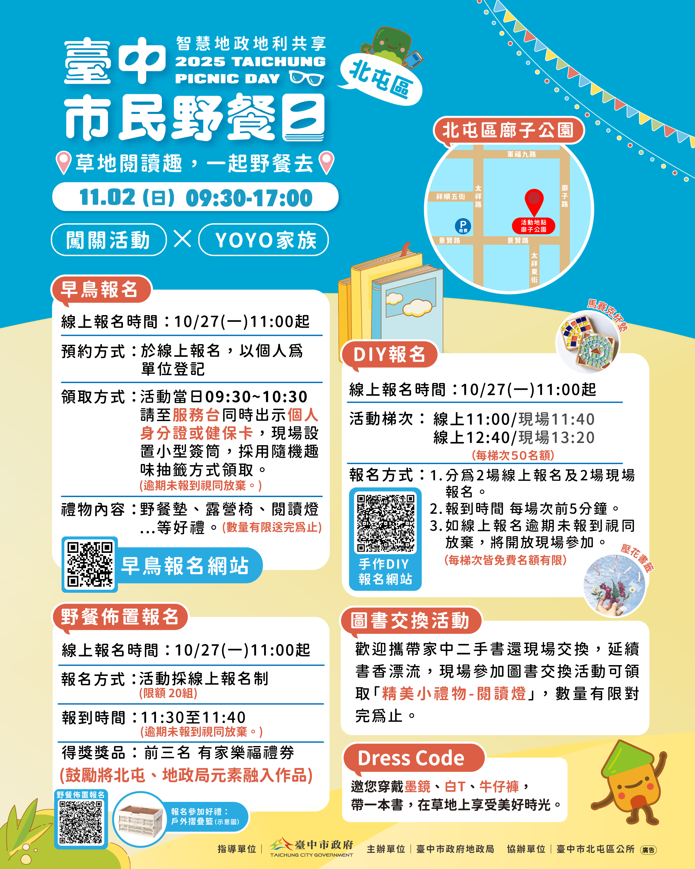 隨著秋意漸濃,微風輕拂書頁與草香,北屯區將於 11月2日(星期日)上午9時30分起,在北屯區廍子公園舉辦「2025台中市民野餐日」,以「草地閱讀趣,一起野餐去」為主軸,邀請市民朋友相約帶一本書、戴墨鏡,於草地共度悠閒秋日時光,享受閱讀、音樂與野餐交織的城市風景,當天廍子公園將設置多個主題區域,融合音樂、文化、美食與創意體驗,打造多元豐富的城市野餐節。