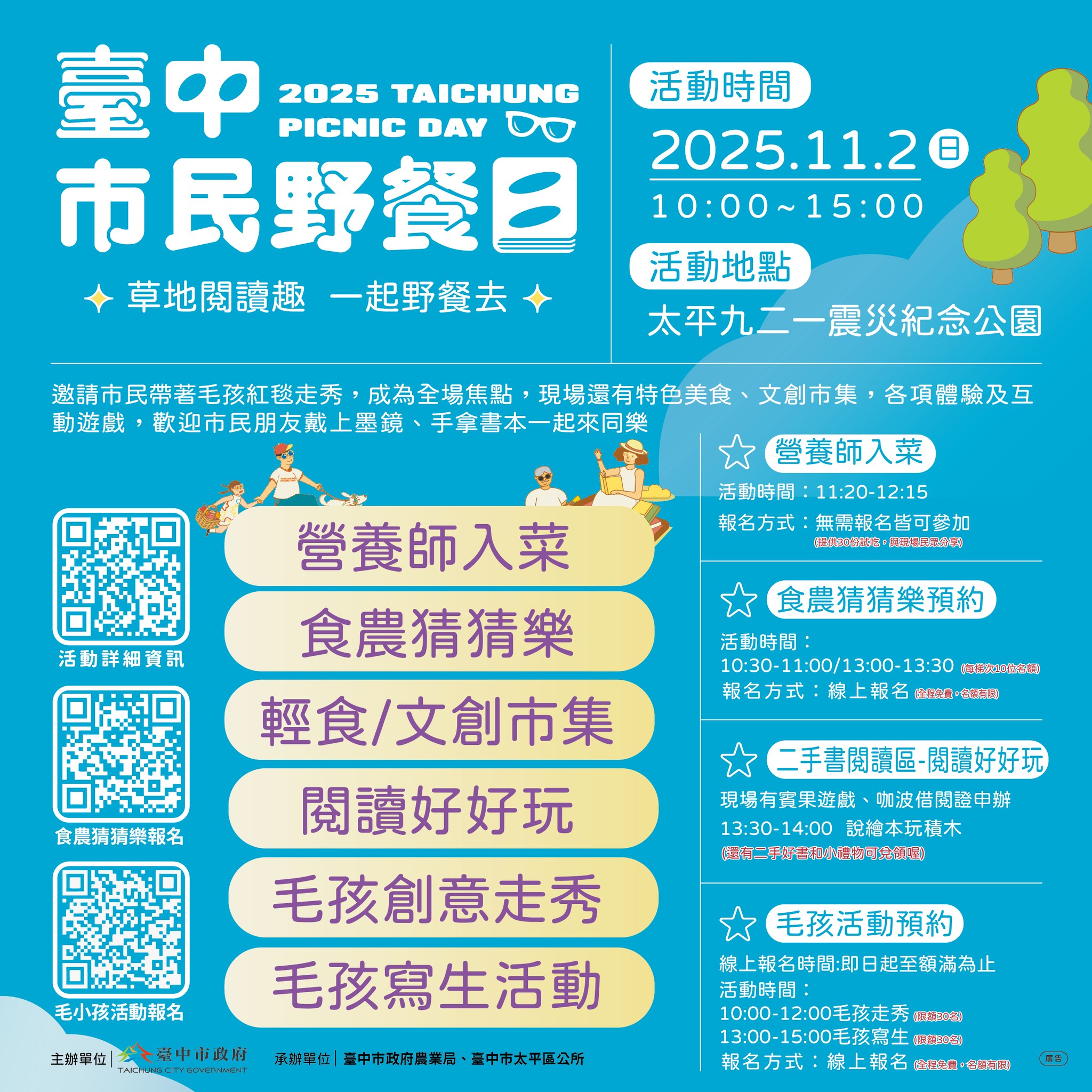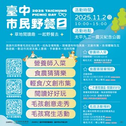 台中市政府農業局攜手台中市太平區公所與台中市立圖書館太平分館共同規劃的「2025第四屆台中市民野餐日」,將於11月2日上午在太平九二一震災紀念公園舉行。今年市民野餐日以「草地閱讀趣,一起野餐去」為主題,邀請市民朋友攜帶好書,走進公園,與最親愛的人在草地上享受閱讀及野餐的悠閒時光。