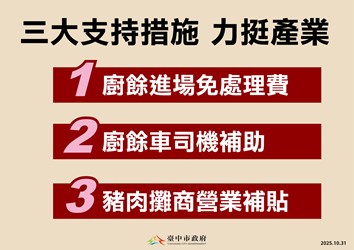 非洲豬瘟中央前進應變所及台中市政府今(31)日上午召開記者會,台中市長盧秀燕率領市府團隊一同出席。盧市長表示,跨局處防疫工作持續進行,與中央攜手防疫合作順暢,今日宣布三大支持措施,包括「免收廚餘處理費」、「發放清運津貼」、「加碼補助豬肉攤商」力挺產業,並回溯至10月23日起適用,相關補助將加快行政作業,務求資源即時送達第一線,共同防堵疫情。