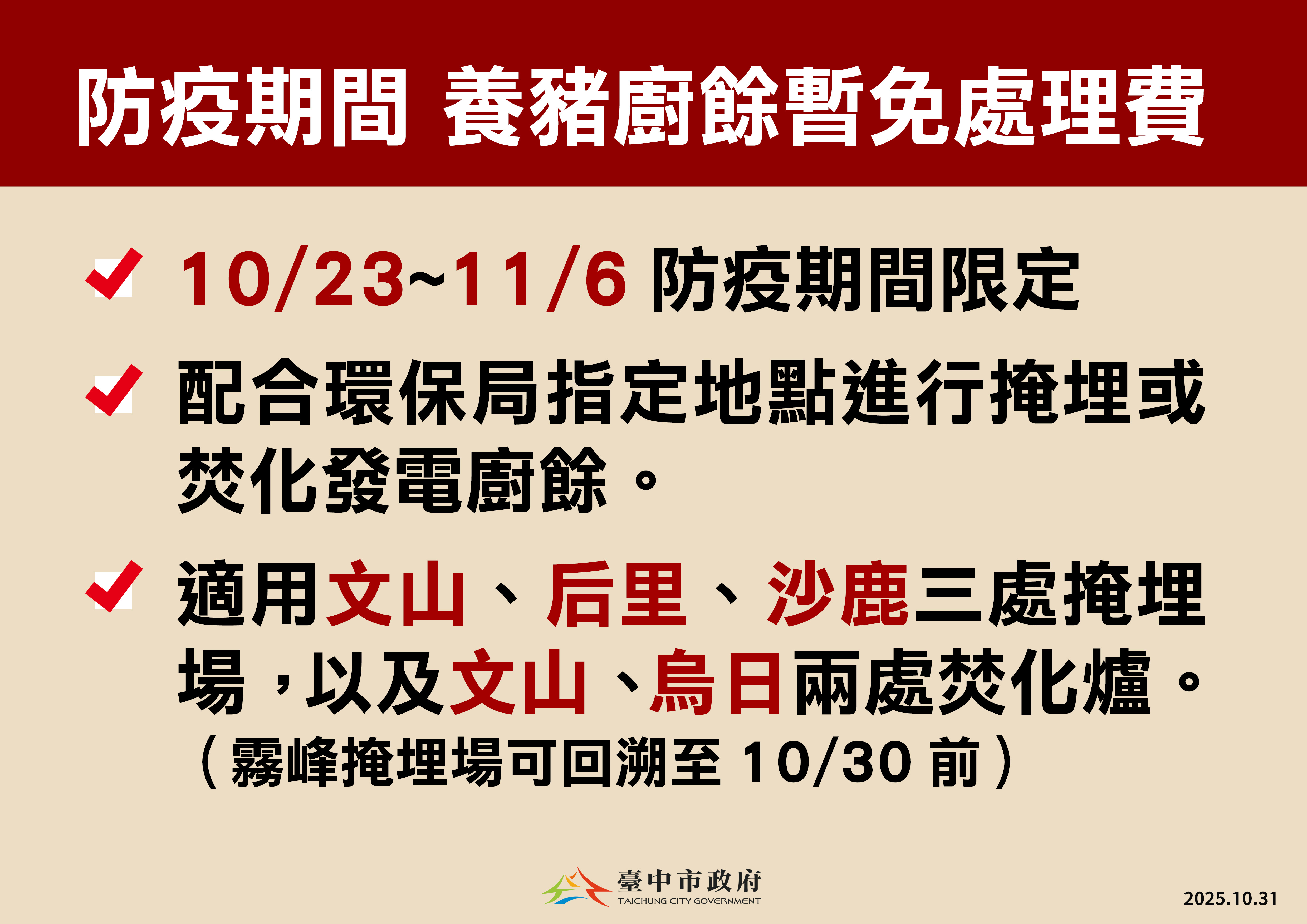 環保局指出,市府依中央指引去化廚餘,以焚化發電與沼氣發電為主、衛生掩埋為輔,臨時開設的垃圾衛生掩埋場已從9處縮減至3處,僅保留文山、沙鹿、后里三處並依規加嚴執行,每50公分廚餘即覆土30公分,每日作業結束後再加厚覆土至少50公分,全面消毒降低野生動物覓食風險,所有車輛也須完成清洗與消毒程序才可離場;同時,10月28日起已開放文山及烏日焚化廠收受養豬廚餘,昨日廚餘進廠焚化量約188公噸,累計已達540公噸,將持續彈性調度各處理設施,穩定去化廚餘。